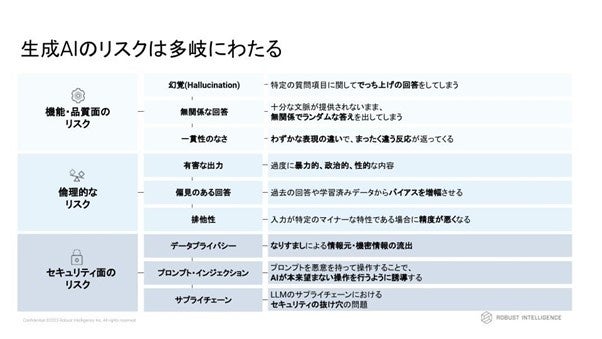 AIのリスクを適切に管理したモデルの運用“AI Integrity”を実現するシリコンバレー発のAIスタートアップ・Robust Intelligence, Inc.(本社:米国カリフォルニア州、CEO:ヤローン・シンガー、Co-Founder:大柴 行人、以下:ロバストインテリジェンス)は、生成AIモデルのリスクを検証・分析する「生成AIリスク評価サービス」の提供を開始します。