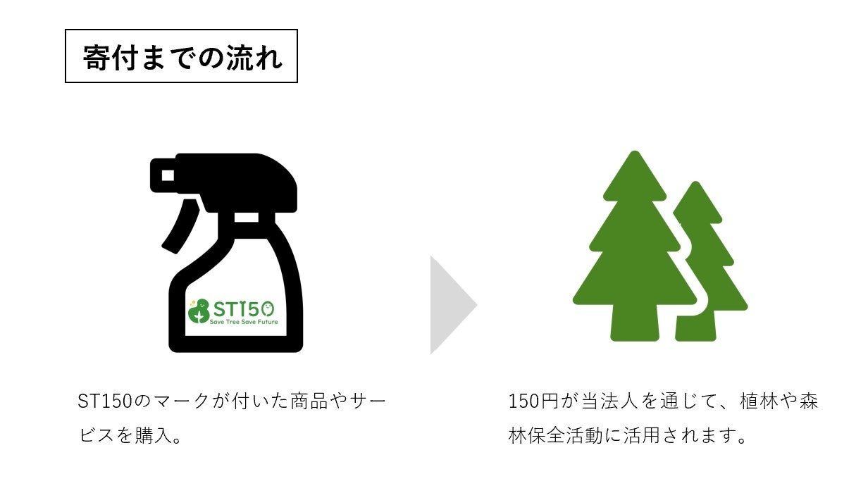 今回開始する「ST150」のSTは「Save Tree」の略で、150は植林に使用するヒノキの苗木1本の購入価格を意味しています。ST150のマークが付いた商品やサービスを一般消費者の方が購入すると、150円が当法人を通じて、植林や森林保全活動に活用されます。