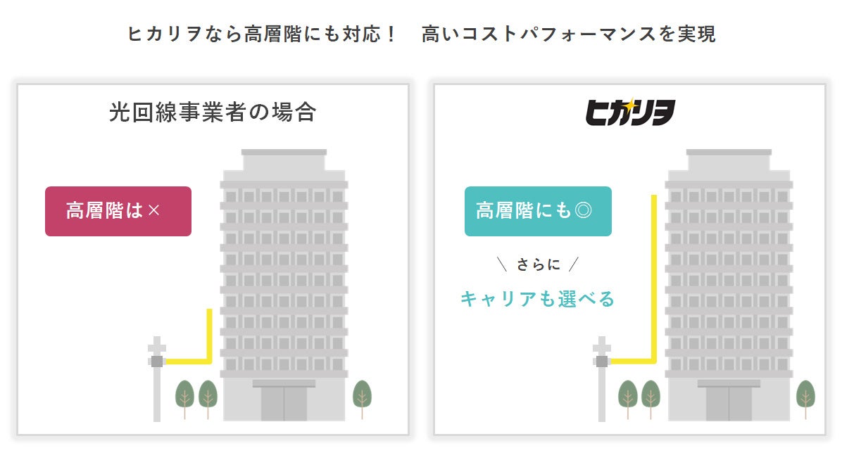 今回、当社では建設段階で予め光設備を構築しておくことで、初期導入コストを抑えながら、各光キャリアの開通を可能にしました。これにより利用者は、高層階にあっても複数あるキャリアから自由に回線サービスを選べ、最大下り2Gbps*の高速インターネットが利用できるようになりました。