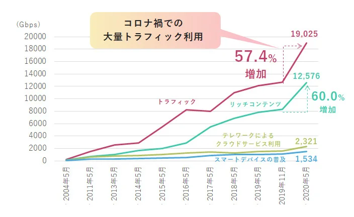 総務省が2020年7月31日に発表した日本のインターネットトラフィックの集計・試算結果によると、2020年5月の固定系ブロードバンドサービス契約者による総ダウンロードトラフィックは前年同月比で57.4%増と右肩上がりで増加しており、新型コロナウィルスの影響によるテレワーク利用やオンライン学習の増加、スマホの普及による動画視聴などが影響していると指摘しています。
