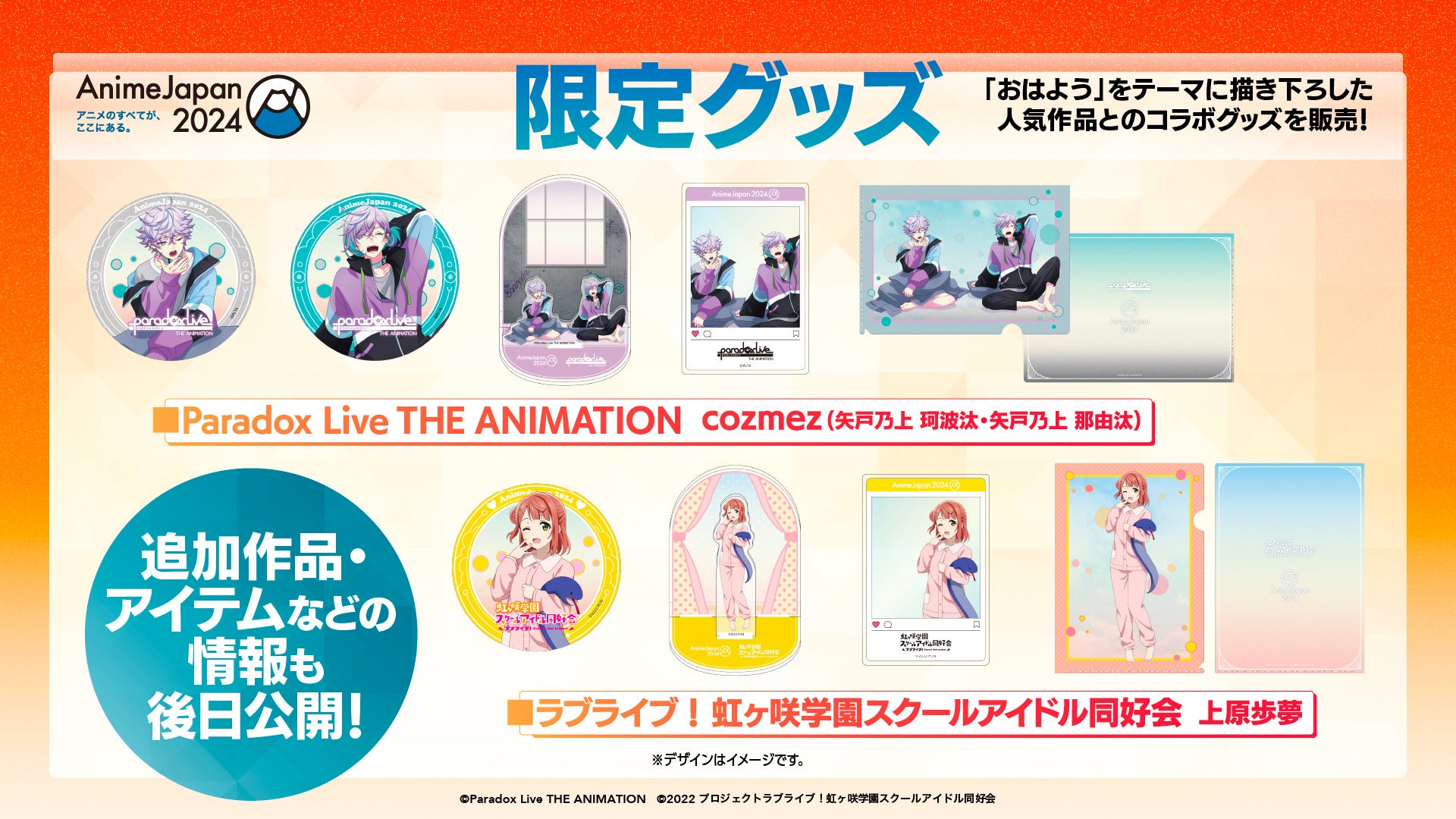 毎年人気を博しているキービジュアルのイラストを使用したオフィシャルグッズの詳細が決定。恒例のAJガチャ(缶バッジ)をはじめ、アクリルキーホルダーなどが販売されます。また、AJ限定グッズの第1弾として、「Paradox Live THE ANIMATION」(cozmez)、「ラブライブ!虹ヶ咲学園スクールアイドル同好会」(上原歩夢)の描き下ろしイラストを使用した缶バッジ、アクリルジオラマ、アクリルカード、クリアファイルの販売が決定!イラストのテーマは「おはよう」となっており、清々しい朝の目覚めを感じさせるグッズが登場します。