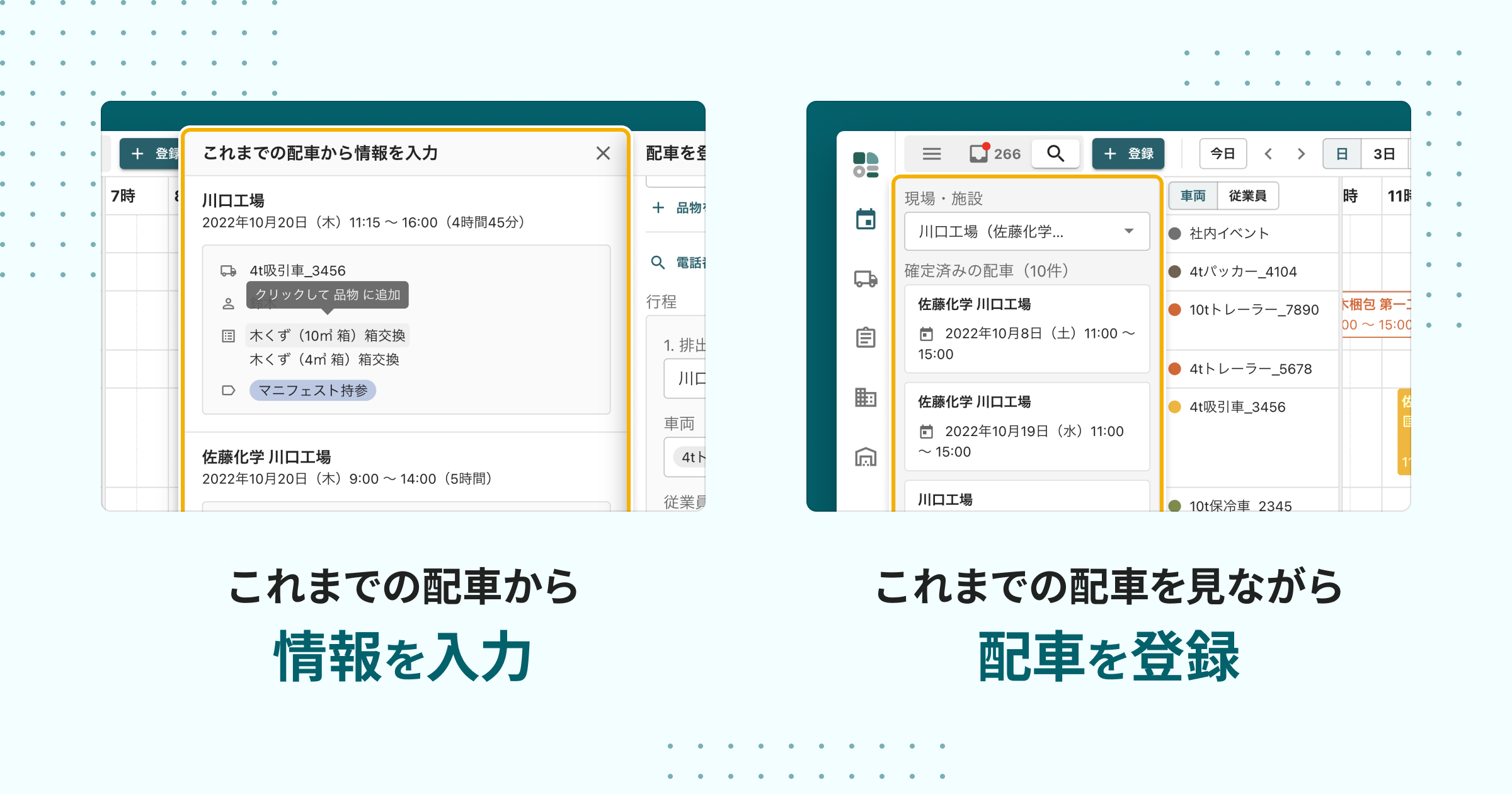 「まにまに」の配車表上で、排出事業者や廃棄物の排出場所、処分場をはじめとする現場・施設の名称に紐づいて、これまでに組んだ実績のある配車情報を登録日順に10件まで閲覧することが可能になります。車種や担当従業員、運搬した品物の種類、および所要時間などの情報を確認し、そのまま引用することで、新たな配車予定を作成することが可能です。
