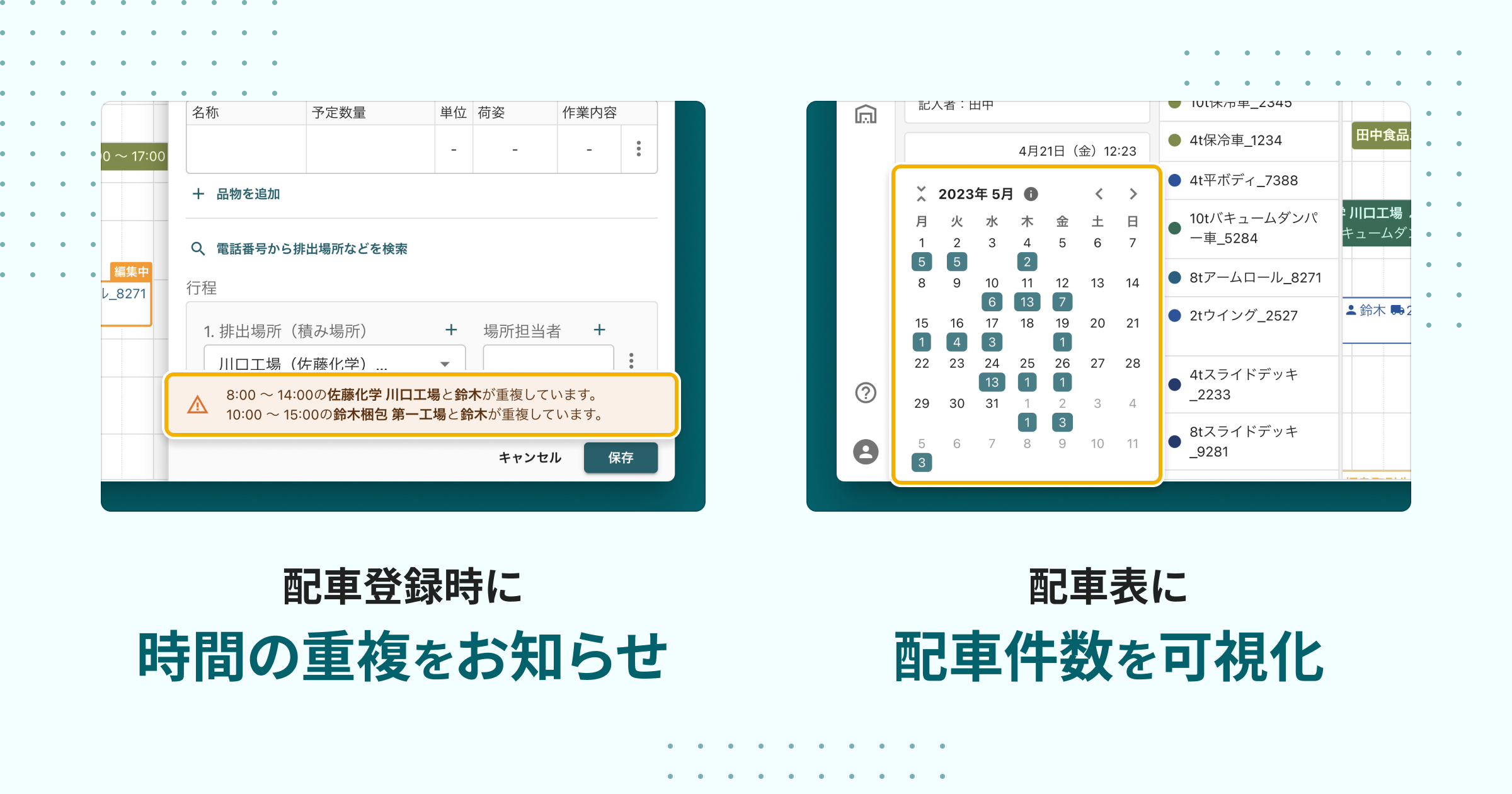 その他、各日程ごとの配車件数が可視化できる機能や配車時間が重複した予定についてお知らせする機能があります。