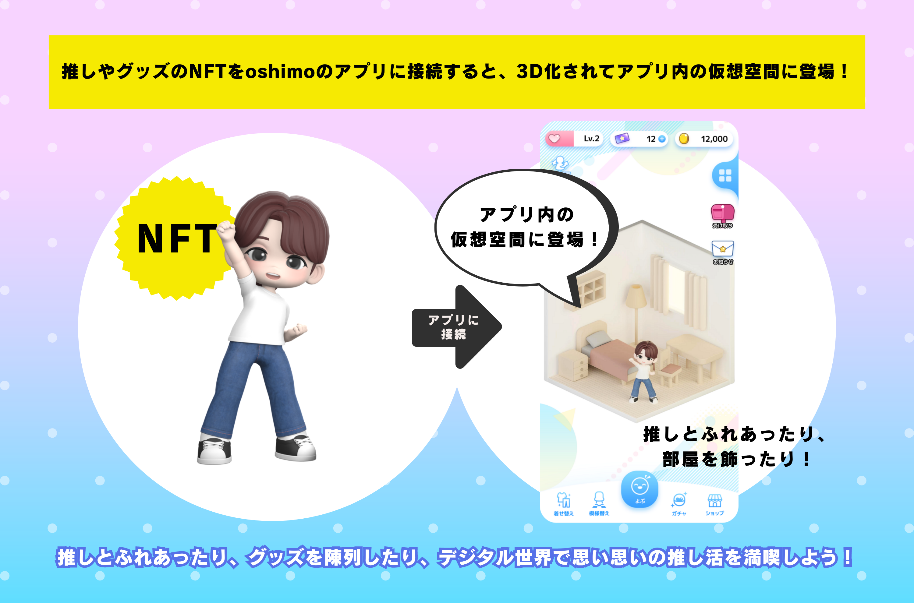 oshimoにNFTを接続することで、3D化された推しのデフォルメキャラやグッズがアプリ内の仮想空間に登場。