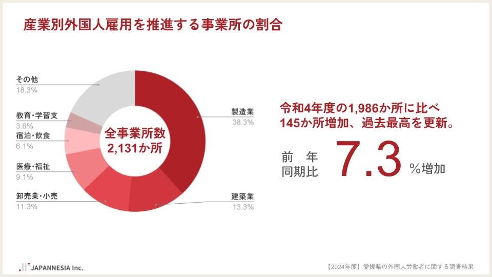 外国人雇用を推進する事業者数は、前年比より145か所増加の2,131か所(前年同期比+7.3%)となりました。