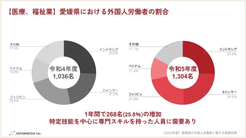 愛媛県の医療・福祉業における外国人労働者数は、前年比より268名増加の1,304名(前年同期比+25.8%)となりました。
