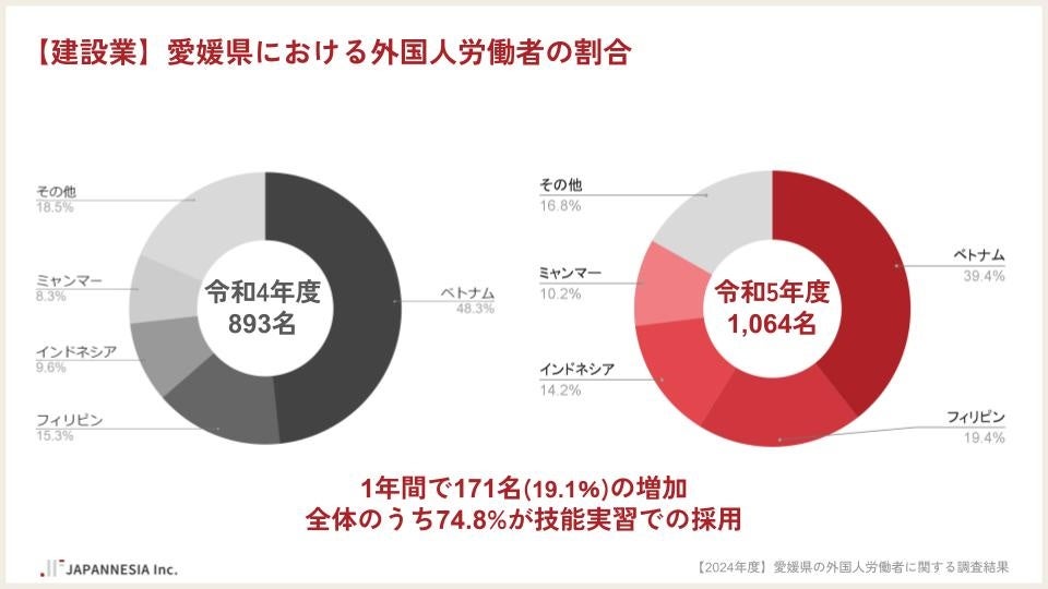 愛媛県の建設業における外国人労働者数は、前年比より171名増加の1,064名(前年同期比+19.1%)となりました。