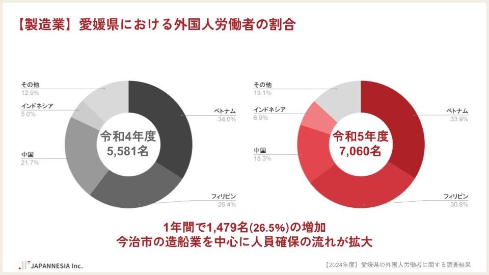 愛媛県の製造業における外国人労働者数は、前年比より1,479名増加の7,060名(前年同期比+26.5%)となりました。
