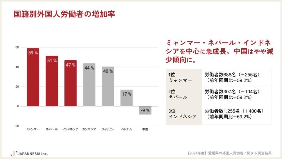 愛媛県の外国人労働者のニーズは、国籍に関わらず需要が高い傾向