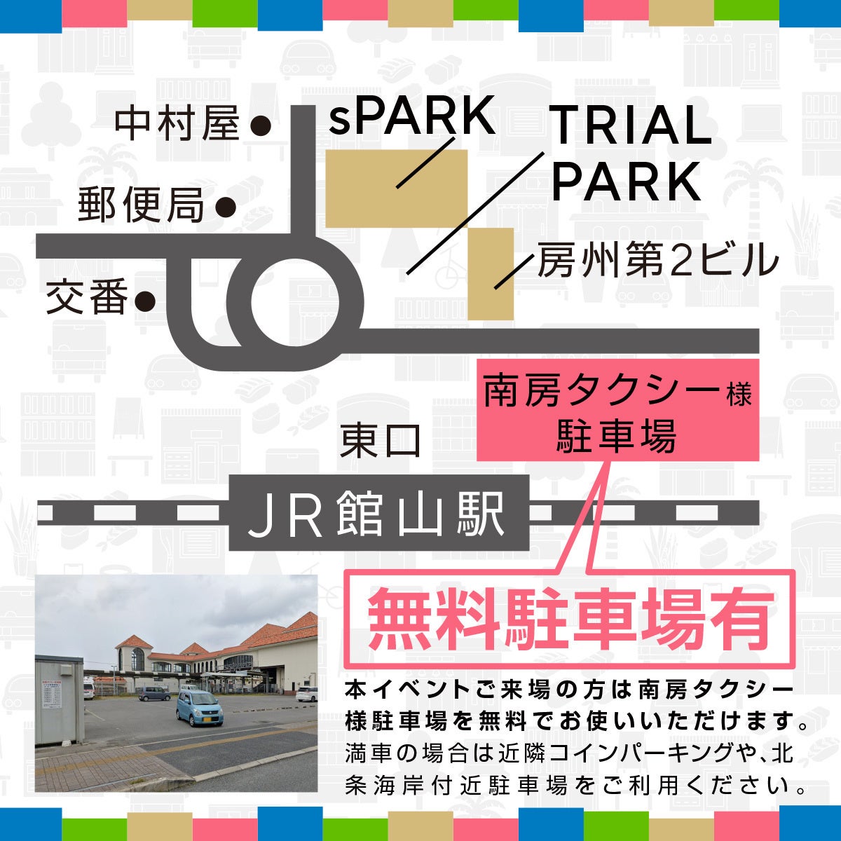 駐車場は館山駅東口すぐにある、南房タクシー駐車場です。普段は有料ですが、当日のみ特別無料となります。