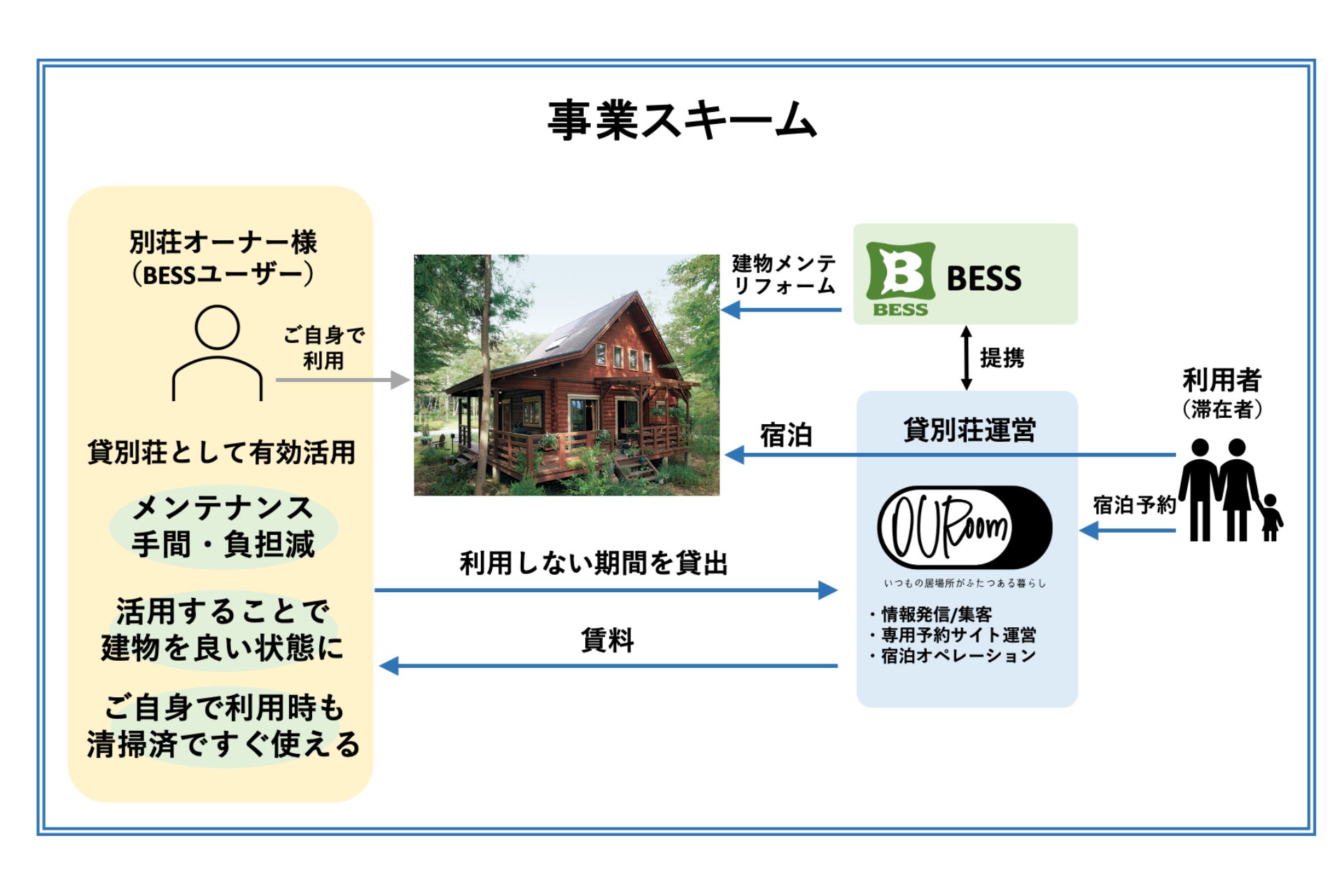 本事業は、別荘物件をオーナーが使用しない期間借り受け、宿泊サービスとして貸し出すバケーションレンタル事業です。物件は、ログハウスを中心にBESSの別荘を建てたオーナーから募集します。長期保有で活用頻度が低下しているが手放すまでではないという別荘オーナーにとって、活用しない時期をレンタルで貸し出し、収益に変えられることで、別荘の維持管理費の負担軽減ができ、長期で別荘を保有し続けられる点が魅力になります。一方で宿泊サービスの提供対象者は、OURoomのサブスク会員に加え、BESSの別荘の新築検討者、いつかはBESSの別荘を持ちたい方、二地域居住を実践したい方などを想定し、別荘市場の活性化に寄与します。