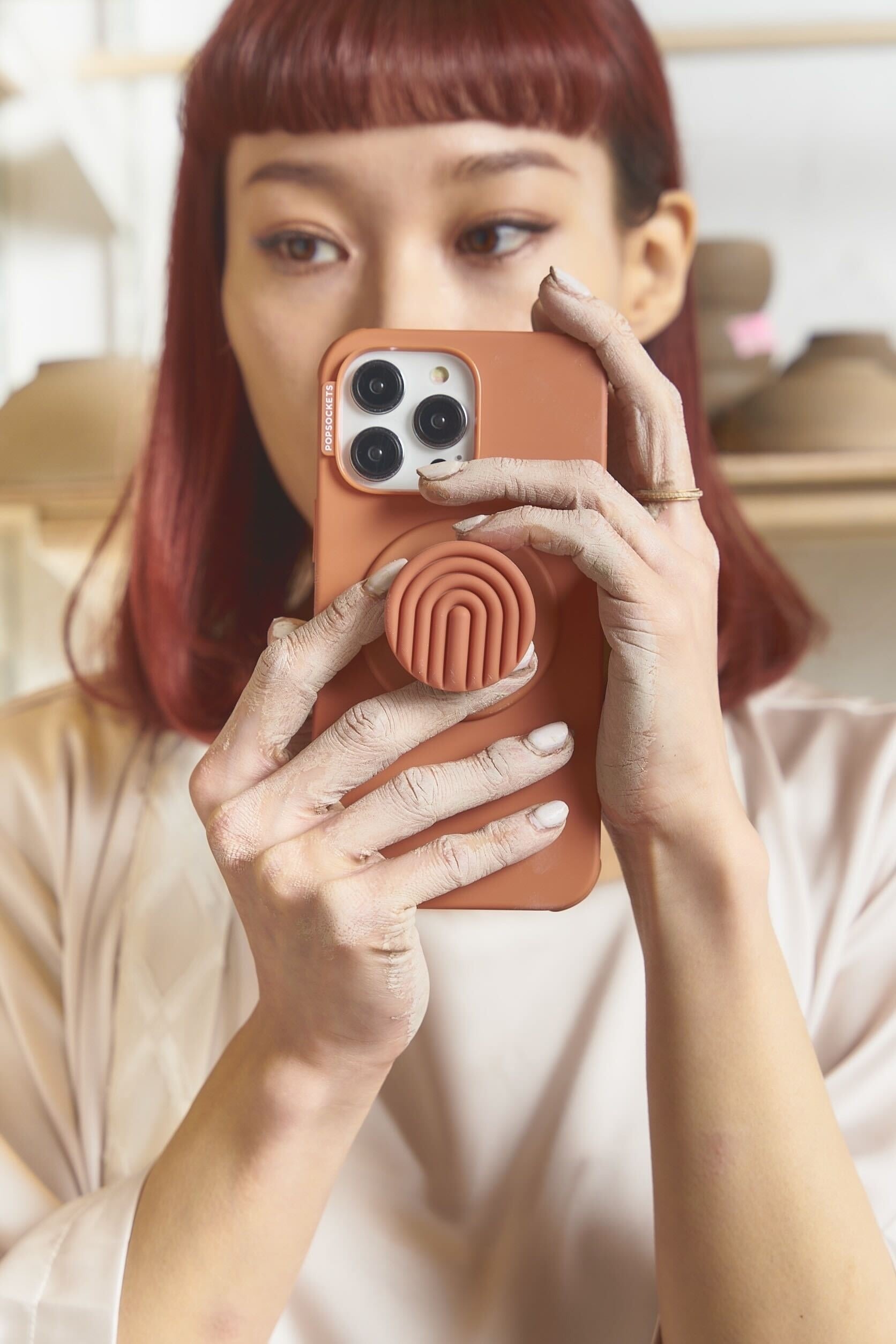 この度のコラボレーション コレクション「PopSockets x AMATERAS」は、AMATERASの代表を務めデザイナーとしても活躍する佐藤マクニッシュ怜子が、自身が掲げる「守られ抜いてきた日本のあり方や伝統を新しい形でアップデートし世界に広める」という目標のもと、和モダンをコンセプトに日本の伝統や陶磁器から着想を得てデザイン。グリップ部分は枯山水をモチーフにしたパターンを取り入れ、色や質感は伝統的な陶磁器をイメージしたものとなっています。トータルコーディネートとなるようポップケースもマクニッシュがデザインを手掛け、ポップケースおよびグリップともに曙色(テラコッタ)、胡桃(ラテ)、白花(アイボリー)の3色で展開。ケースとグリップを色違いで購入して、好きな色を組み合わせることもできます。