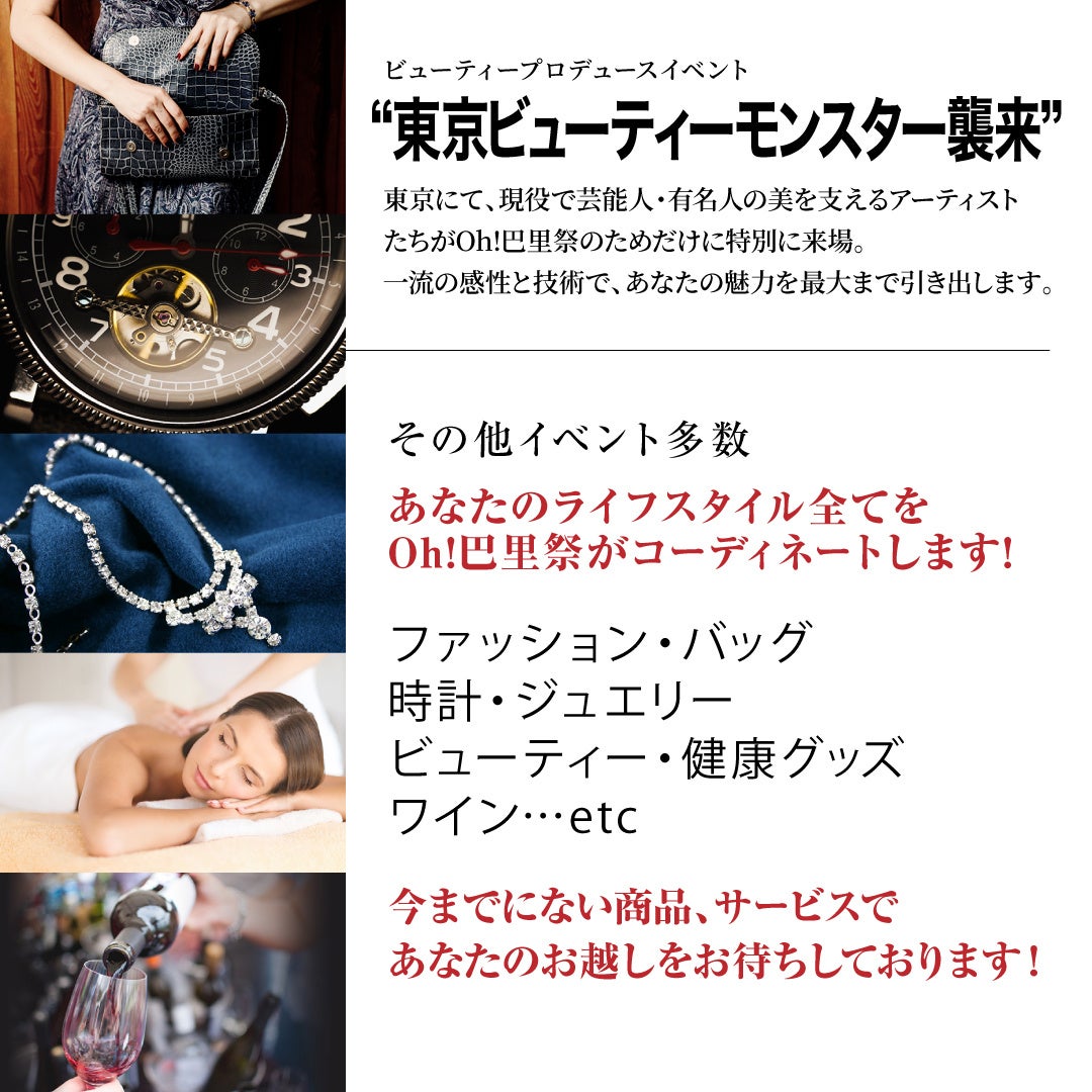 ゲストに東京ビューティーモンスターズを迎え、アパレルやジュエリー、時計、バッグ、ビューティー関連グッズや健康グッズなど、全国から厳選されたアイテムを展示即売。お越しのお客様のライフスタイルを華麗にコーディネートいたします。