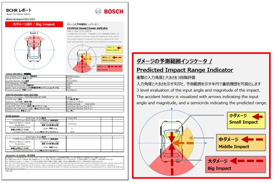 自社ローン専門中古車販売店として東北・関東及び中部に展開するオトロンカーズ株式会社(本社:東京都新宿区、代表取締役:吉武 誠一、以下「オトロン」)は、世界トップクラスの自動車サプライヤーであるボッシュ株式会社(本社:横浜市都筑区、代表取締役社長:クラウス・メーダー、以下「ボッシュ」)が開発したBCHR(=Bosch Car History Report)を活用し、車両骨格のダメージについてEDR(=イベントデータレコーダー)記録に基づくデジタルデータを用いて可視化することで、正確な車両評価を効率的に実現することを可能としました。