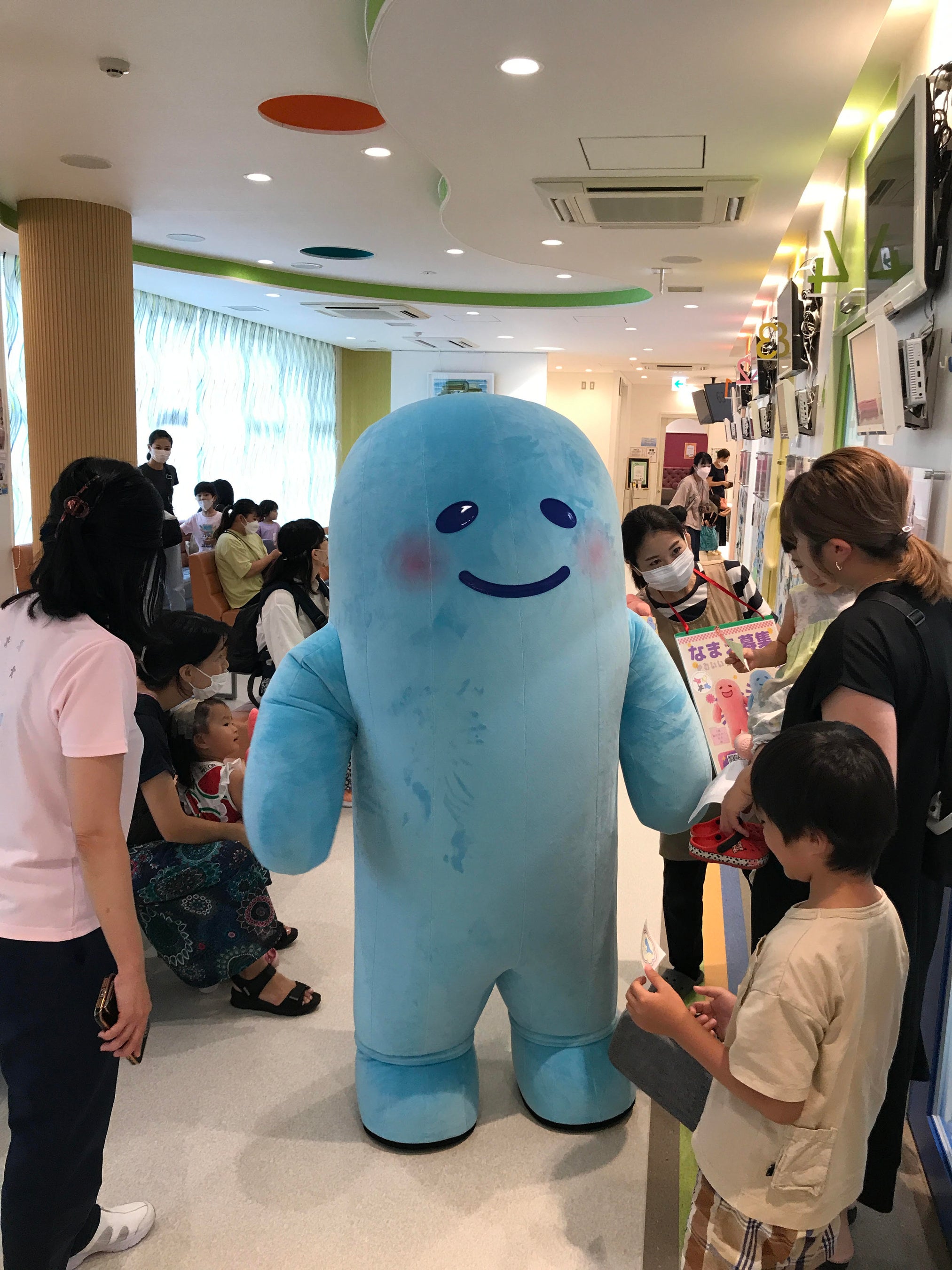夏休み期間ということもあり、診察を待つお子さんから「かわいい!」「写真を撮りたい」と大きな歓声が聞こえ盛り上がりをみせました。乳幼児の患者さんは、着ぐるみを目の前に泣き出す子もいましたが、ご家族やスタッフが微笑ましい表情で見守っていました。