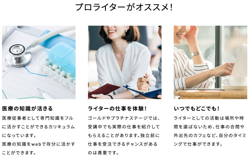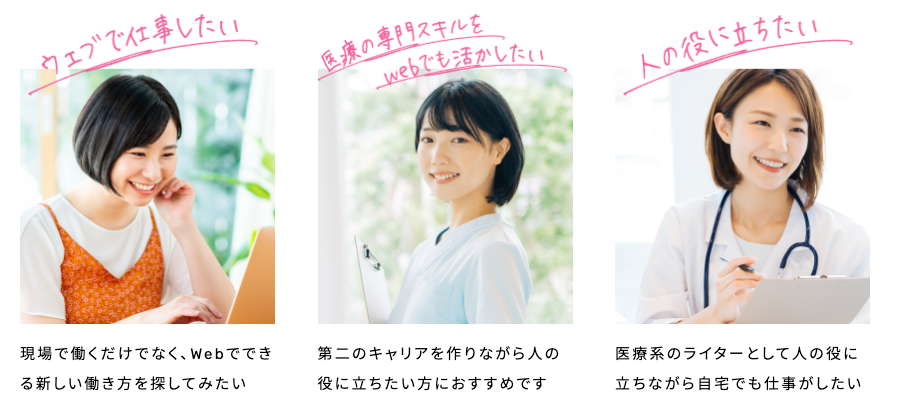医療貢献の場を現場だけでなく、webにも広げていき、医療系ライターとしての知識と働き方を学べるサービスとなっています。