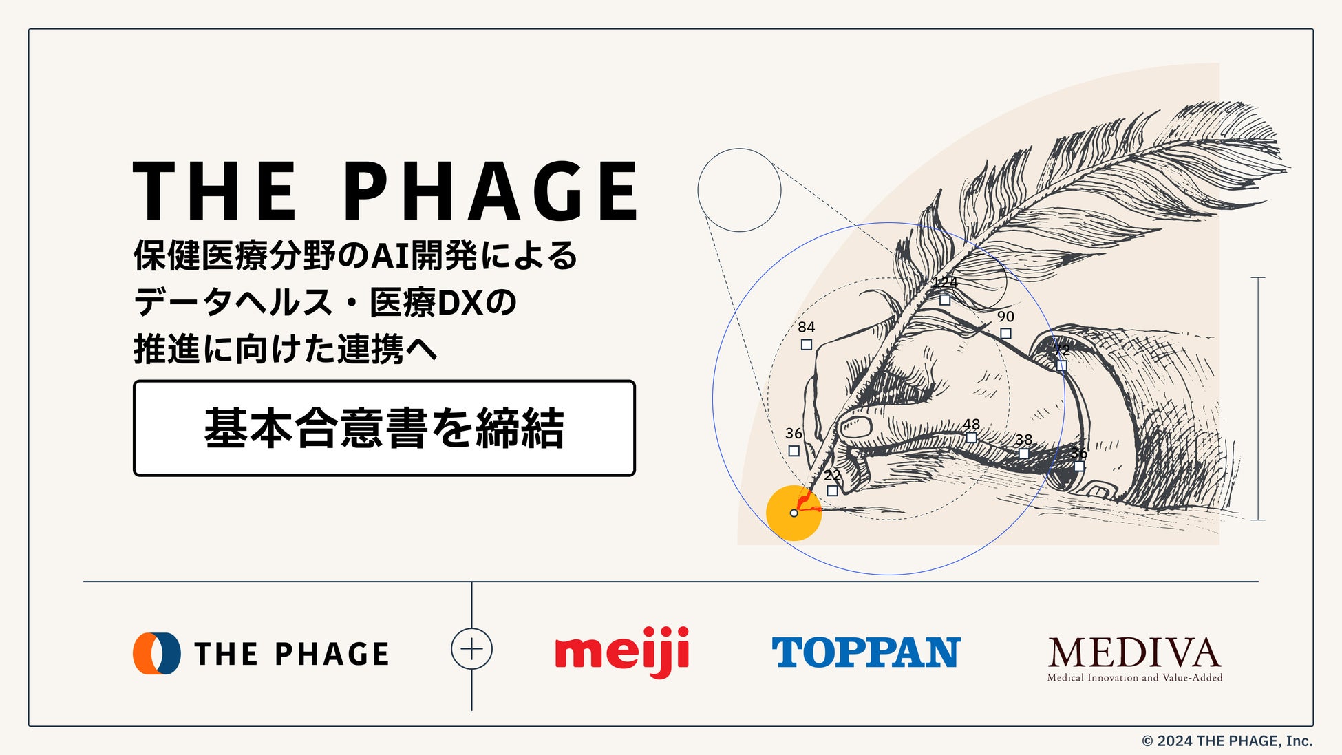 株式会社ザ・ファージ(以下 THE PHAGE)は、株式会社 明治(明治)、TOPPAN株式会社(TOPPAN)、株式会社メディヴァ(もう1社は社名非公開)各社との保健医療分野のAI開発によるデータヘルス、医療DX推進とデータ取得プロジェクトへの参画を通じた研究の推進に向けた連携に関する基本合意書を締結しました。
