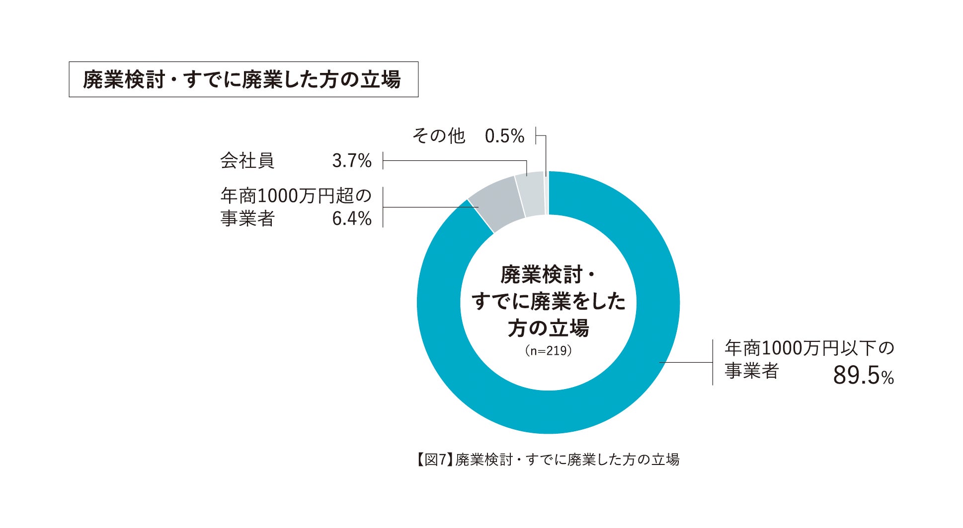 「すでに廃業した」「廃業検討中」と回答した人を年商別に見ると、年商1000万円以下の事業者が9割を占めた(図7)。「登録しないことで新規依頼が激減。一方、登録すれば消費税分を納めると赤字どころではなくなり、現状から踏み出せず辛い」「消費税が納められるか不安。納めたら生活ができない」という悲痛な声にあるように(別紙参照)、登録する/しないにかかわらず収入減となる実態が浮き彫りになっている。