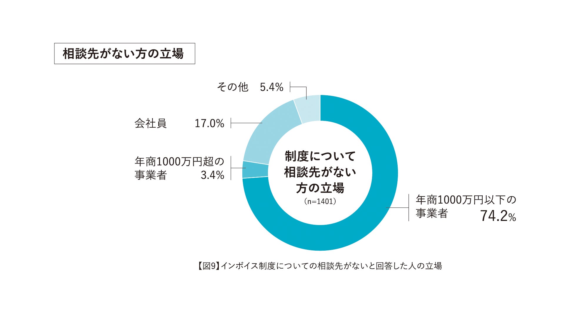 ・相談先のない人の7割超が年商1000万円以下の事業者で、次いで会社員が約2割(図9)