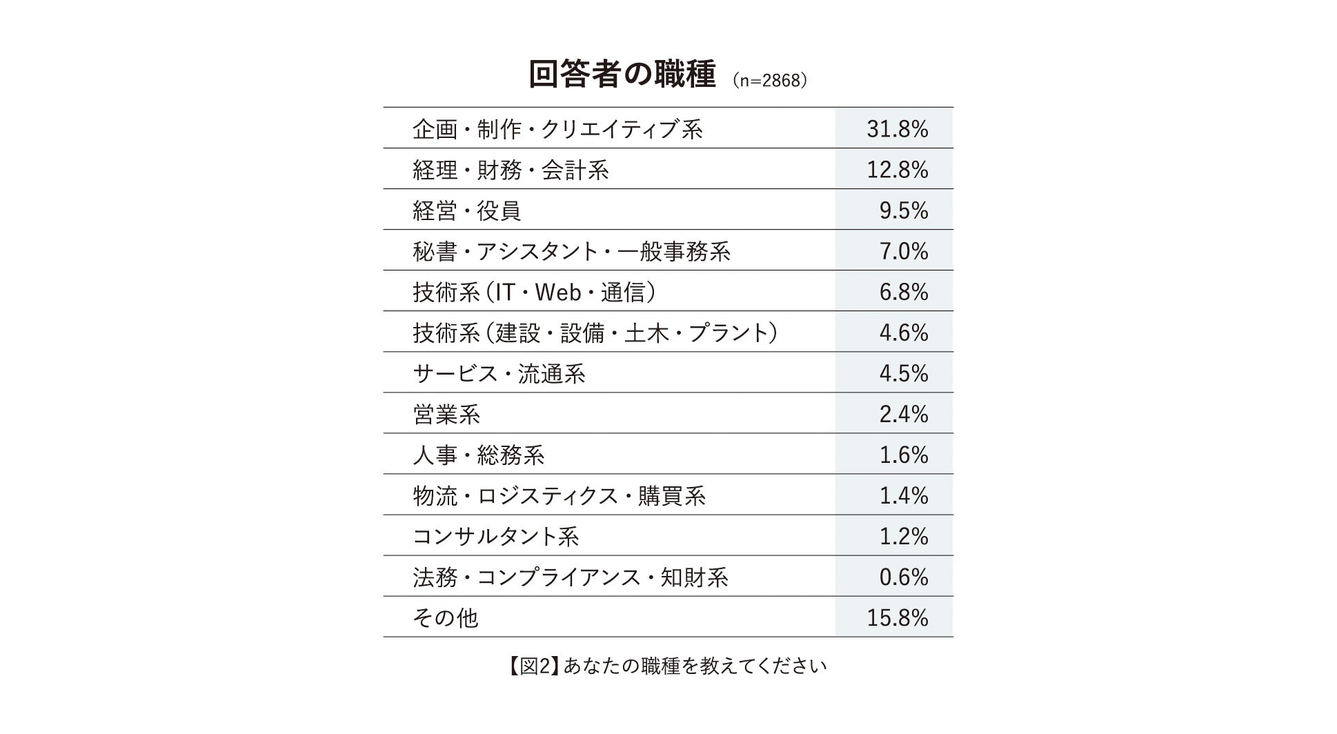 ・職種では、経理や経営、財務にかかわる人とクリエイティブ系で回答者の6割を占めた(図2)