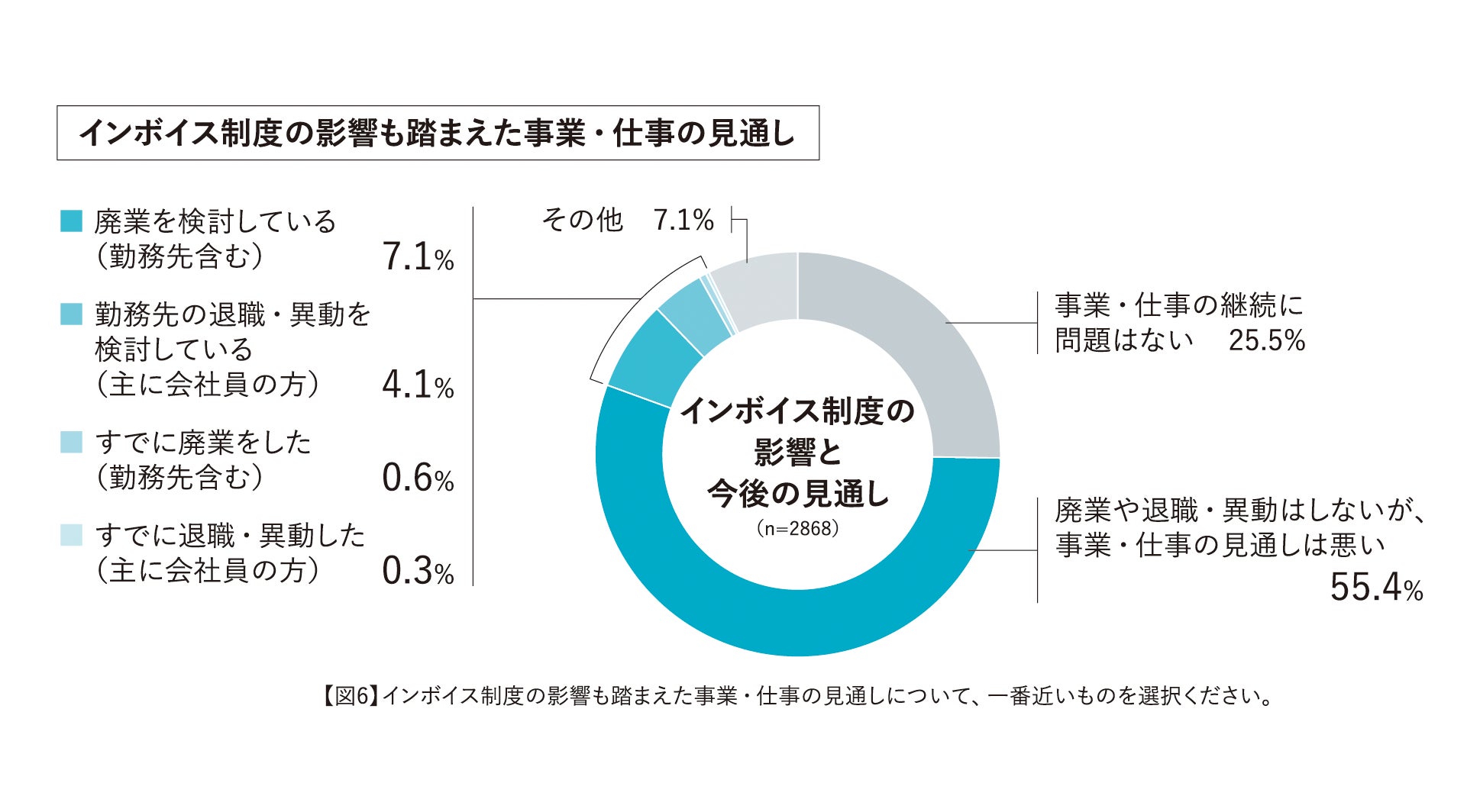 「インボイス制度の影響を踏まえた事業・仕事の見通し」についての設問では、約6割が「見通しは悪い」と回答。「廃業・退職・異動を検討中」「すでに廃業・退職・異動した」の回答は合わせて1割強となり、回答者全体の約7割が、インボイス制度の開始によってマイナスの影響を受けていることがわかった(図6)。インボイス制度による消費税の増税負担や値引きによって報酬減となった人が3割超となっていること、経理事務負担で本来業務が圧迫されていることなどが、将来を不安視させる要因になっていると見られる。