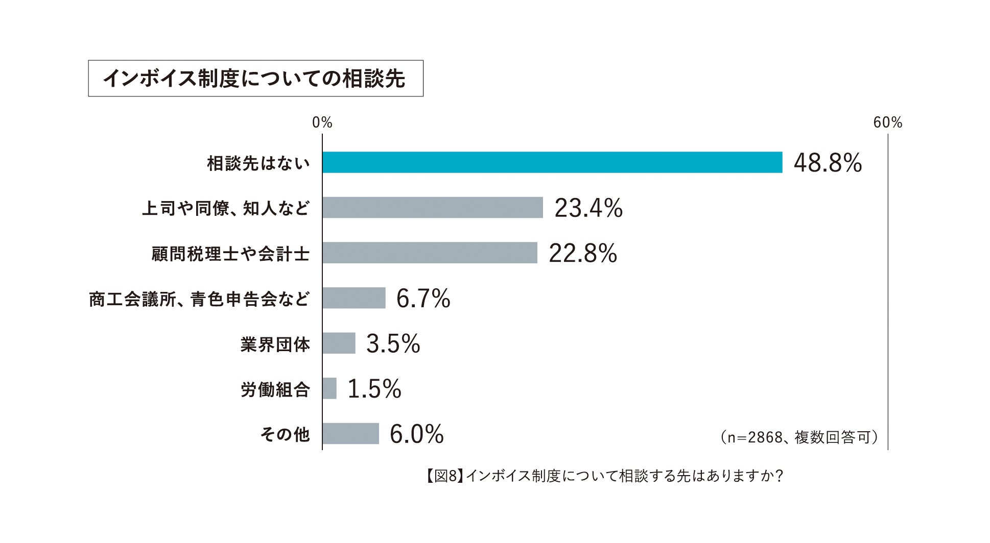 制度開始一ヶ月での本調査では、複雑を極める制度設計と行政による周知不足および相談機能の不全、多くの当事者にとって相談先がない中で開始直後の現場は混乱しており、経済活動や人生の将来設計にまで陰を落としている様が浮き彫りとなった。改めて、現実の商取引や経理の実務にそぐわない現行のインボイス制度は運用停止や中止・廃止を含め、見直しが必要であると考える。