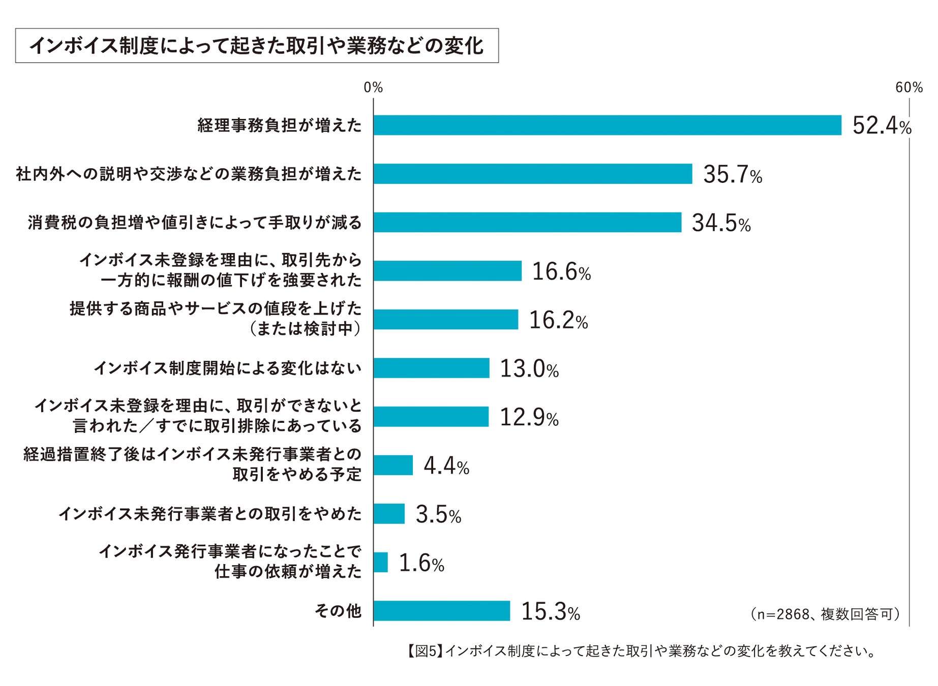 ・2人に1人が「経理事務負担の増加」を感じており、3割超が「説明や交渉の負担」「手取りの減少」を訴える結果に(図5)