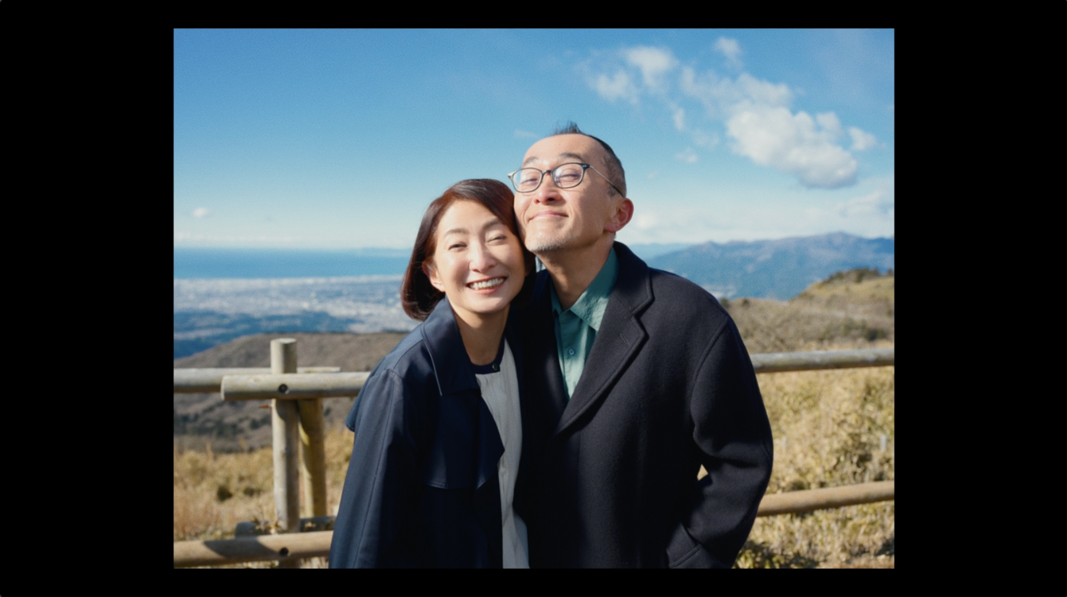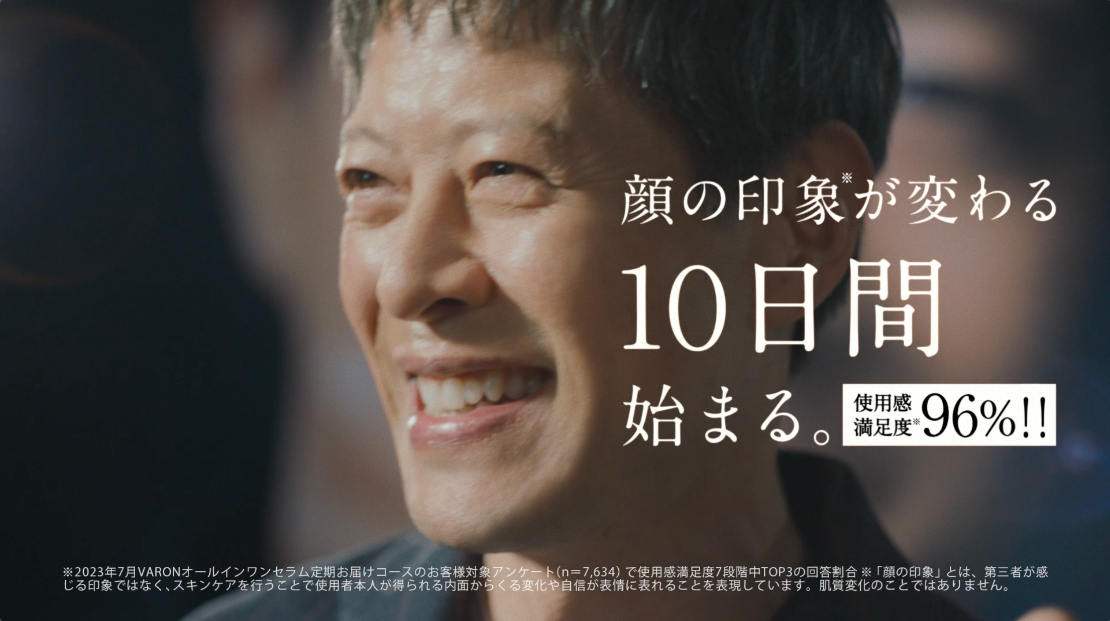 「VARON」に出会って一年経った夫がスキンケアを通して変わったところを妻目線で語っていきます。表情だけでなく、気持ちも「前向きになった」とコメントする妻に、夫は横で恥ずかしそうな表情を浮かべます。「昔みたいにいろんなところに行けたらいいね」という妻のセリフの後、約24年前の夫婦の写真と、同じ格好をしたスキンケアを始めて昔の気持ちが思い出されたような生き生きとした表情の現在の写真が登場します。これからの人生も夫婦で楽しむことが伝わるドライブシーンで幕を閉じます。