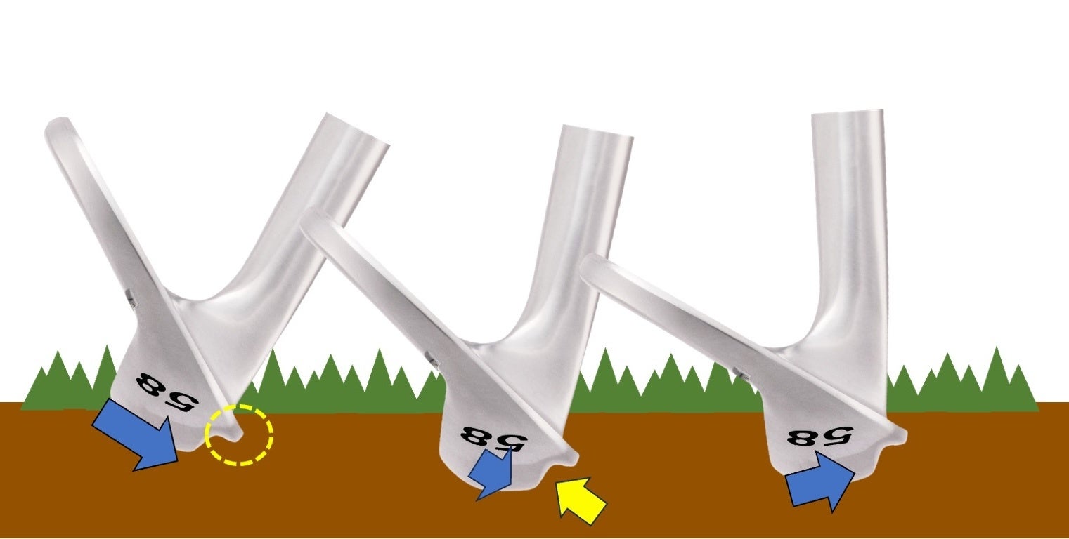 リーディングエッジが細く、通常のウエッジよりも地面に抵抗なく入りやすい