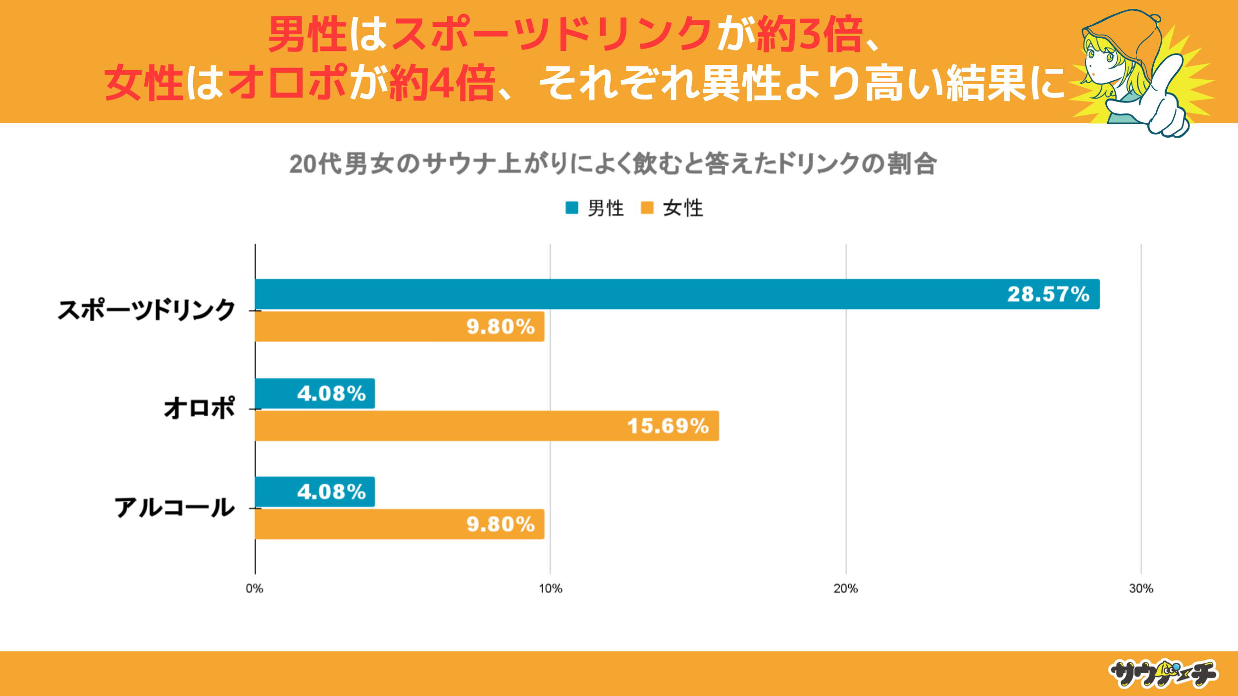 【男性はスポーツドリンクをよく飲むとの回答が約3倍、女性はオロポとの回答が約4倍、異性より高い結果に】