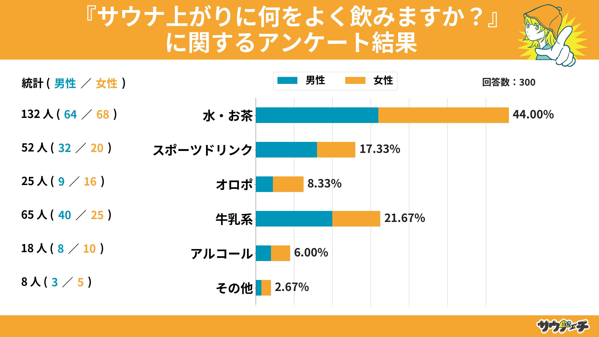 サウナ経験者の15歳〜39歳の男女を対象とした「サウナ上がりに何をよく飲みますか?」というアンケートで最も多かった回答は「水・お茶」で44%でした。