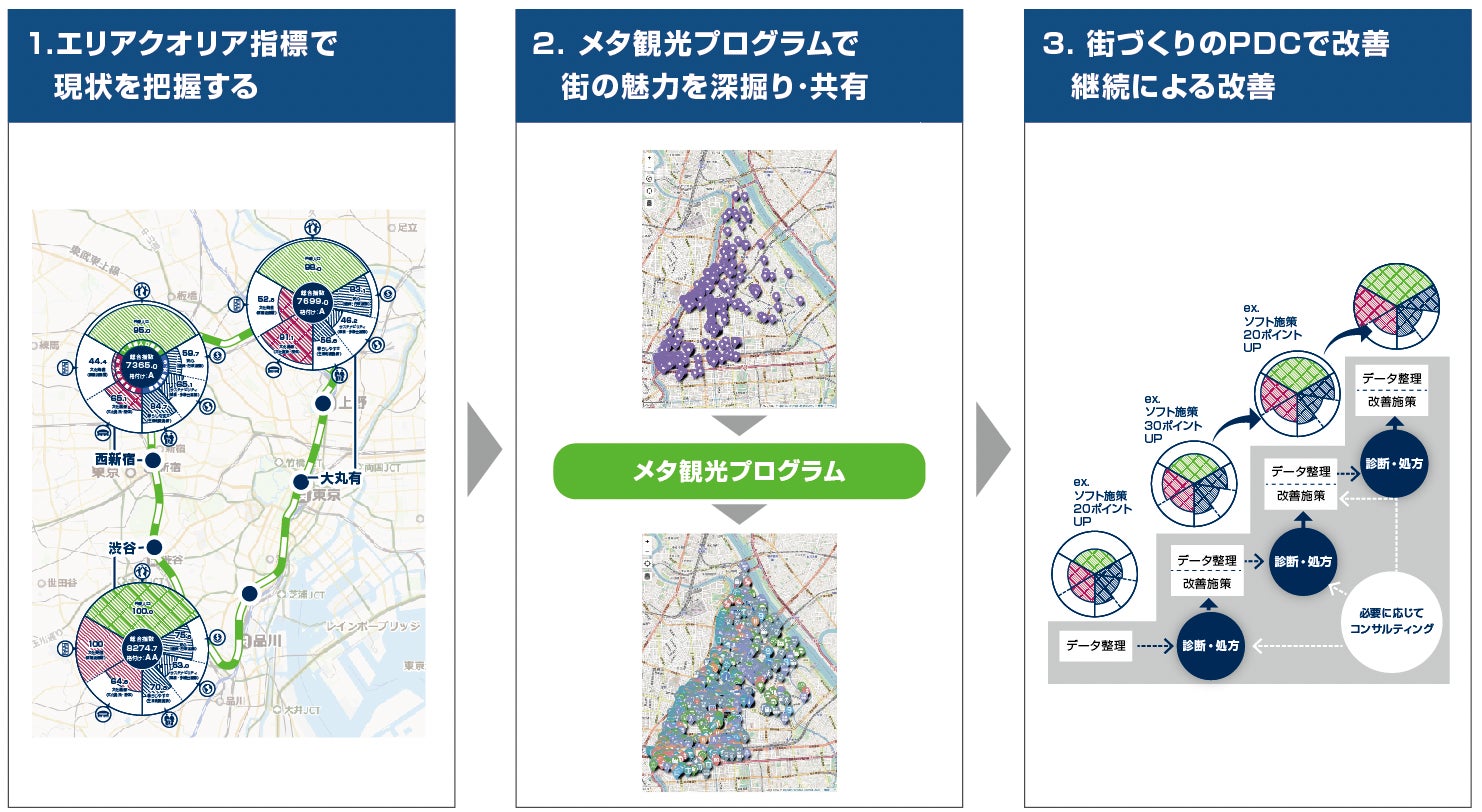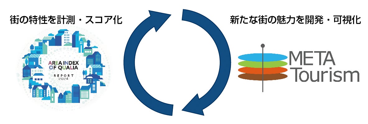 この度の連携プログラムは 街づくりの現状と特性を計測・スコア化する「エリアクオリア指標」と、新たな魅力を開発・可視化する「メタ観光マップ」とを一体的に提供していくことで、継続的に計測・改善させていく「街づくりのPDCAメソッド」になります。