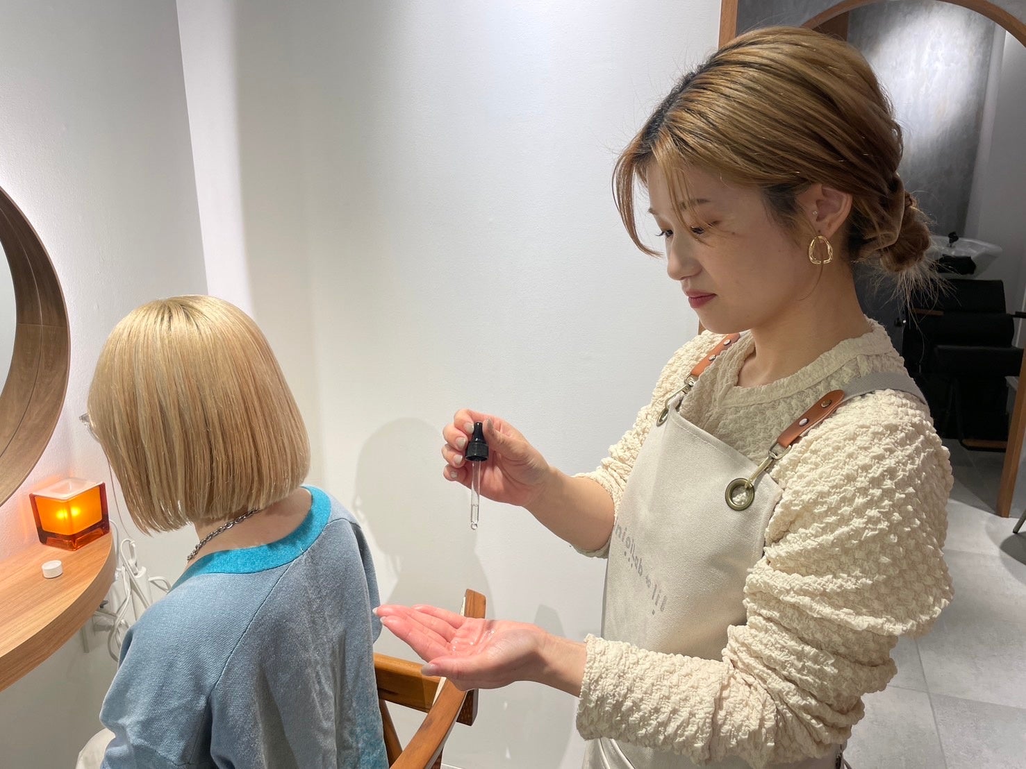 最初のカウンセリングからサロンを出た後の髪と香りまでアフターフォロー(約1か月間※) いたします。店内では忙しい日々の日常から抜け出してお好きな香りに癒されてSwitch OFF。