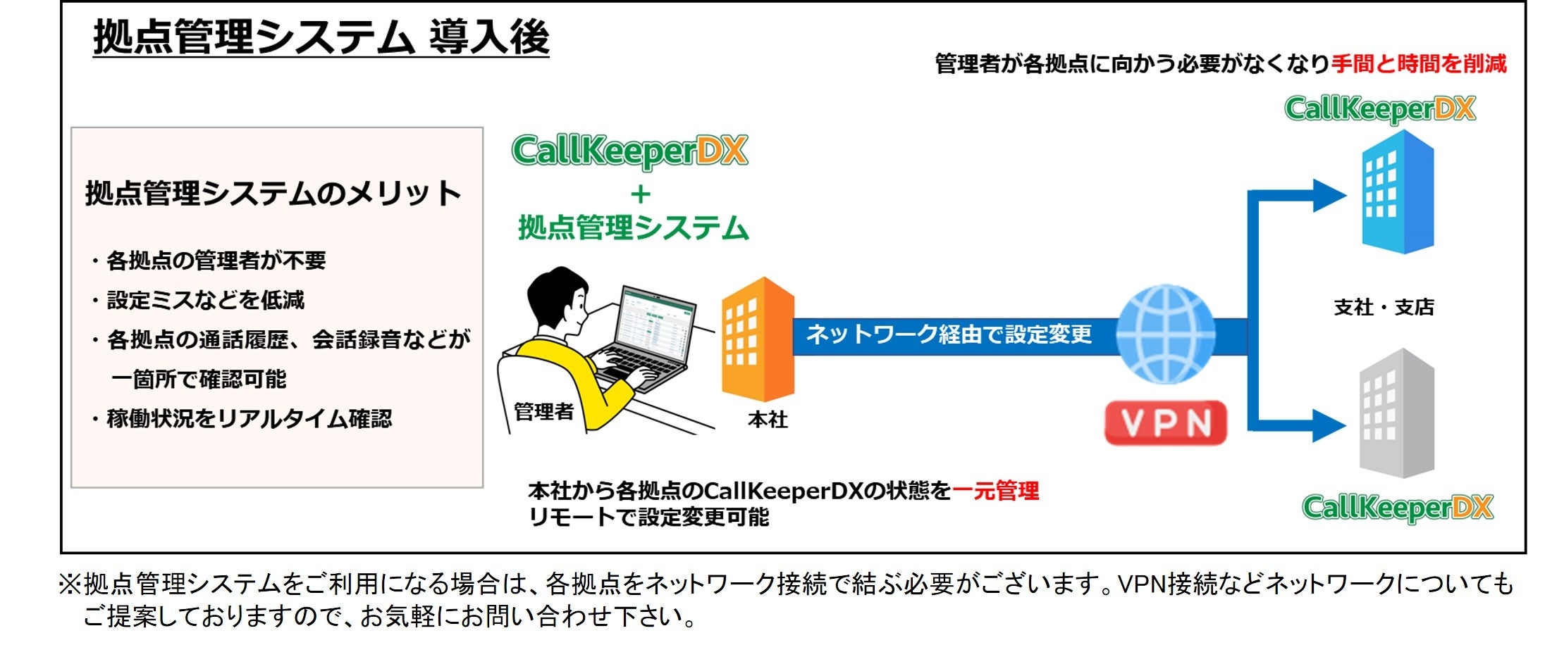 CallKeeperDXにおける拠点管理システムは複数拠点に展開しているCallKeeperDXを、1つの拠点から一元管理・稼働状況の確認ができるシステムです。お客様の業務改善をDXで支援し、これまで以上に便利に安心してご利用いただけます。