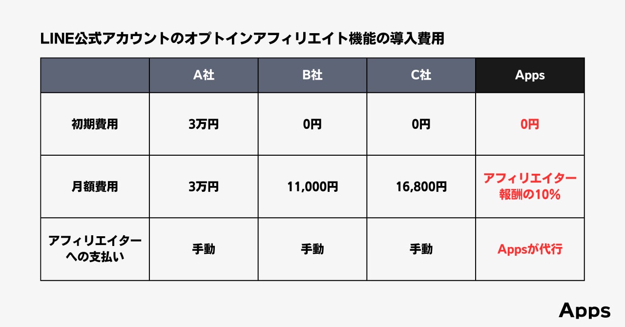 LINE公式アカウント向けのオプトインアフィリエイト導入サービスで比較しました。どのサービスも様々な機能があるため単純比較はできませんが、Appsは導入費用がかからないという点が価格面での特徴です。