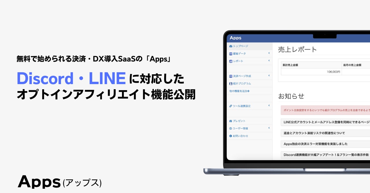 あらゆる挑戦を支援する株式会社アップス(本社:大阪府大阪市北区、代表取締役:中井聖、以下アップス)は、無料で始められる決済・DX導入SaaSの「Apps(アップス)」について、Discord・LINEに対応したオプトインアフィリエイト機能を実装しました。