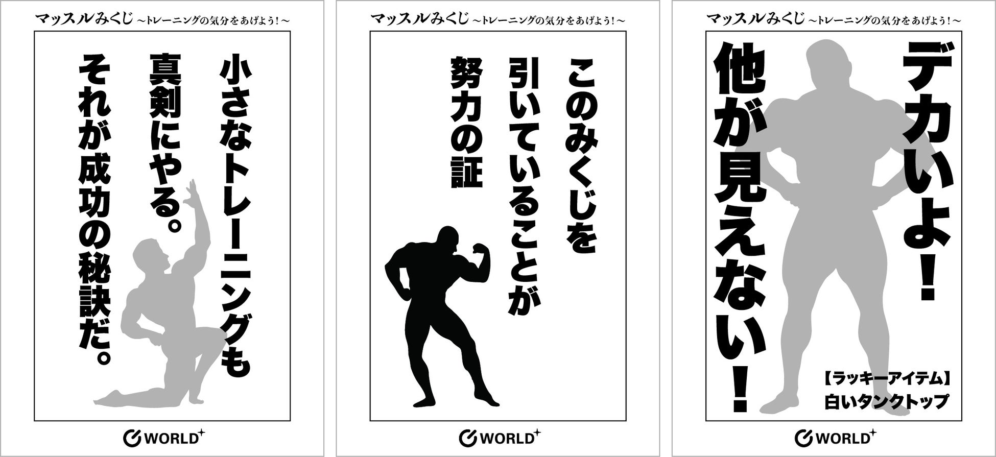 この「マッスルみくじ」は、ワールドプラスジム直営店へお越しになった全ての方が引いていただけます。2023年に初めてワールドプラスジムを利用される方はもちろん、見学で来店された方にも是非引いていただき、どんな言葉が当たるかを楽しんでもらえればと思います。なお、おみくじは直営店全店に設置いたしますが、なくなり次第終了となりますので、是非ともお早めにご来店下さいませ。