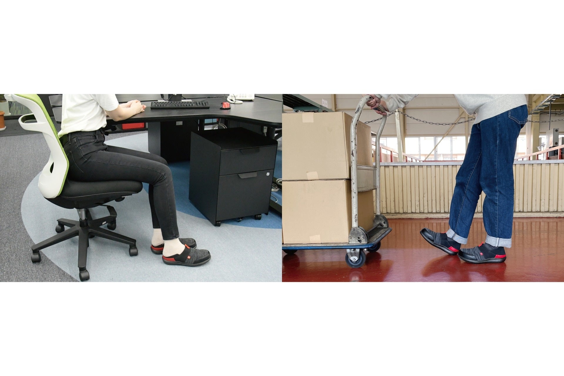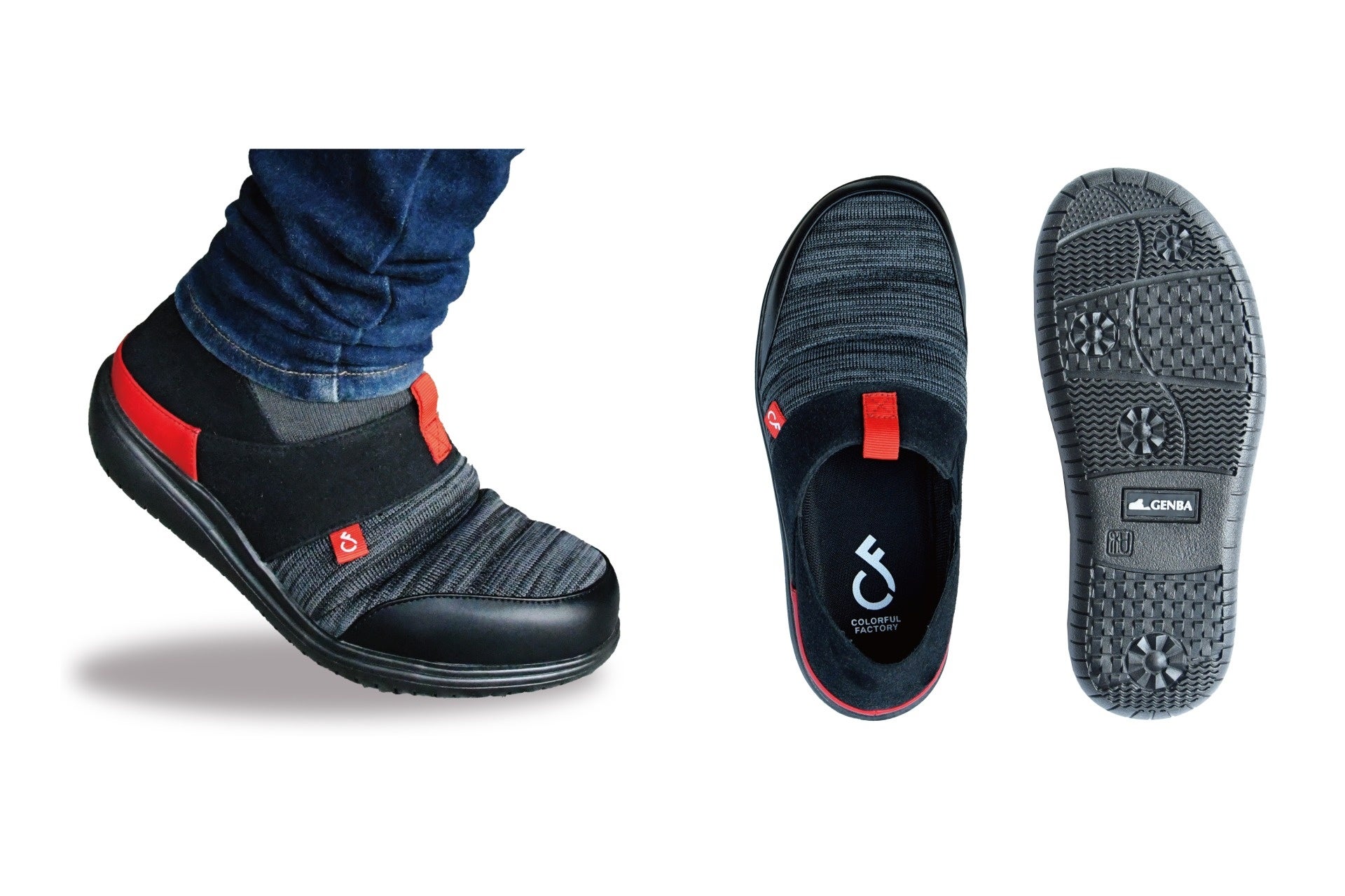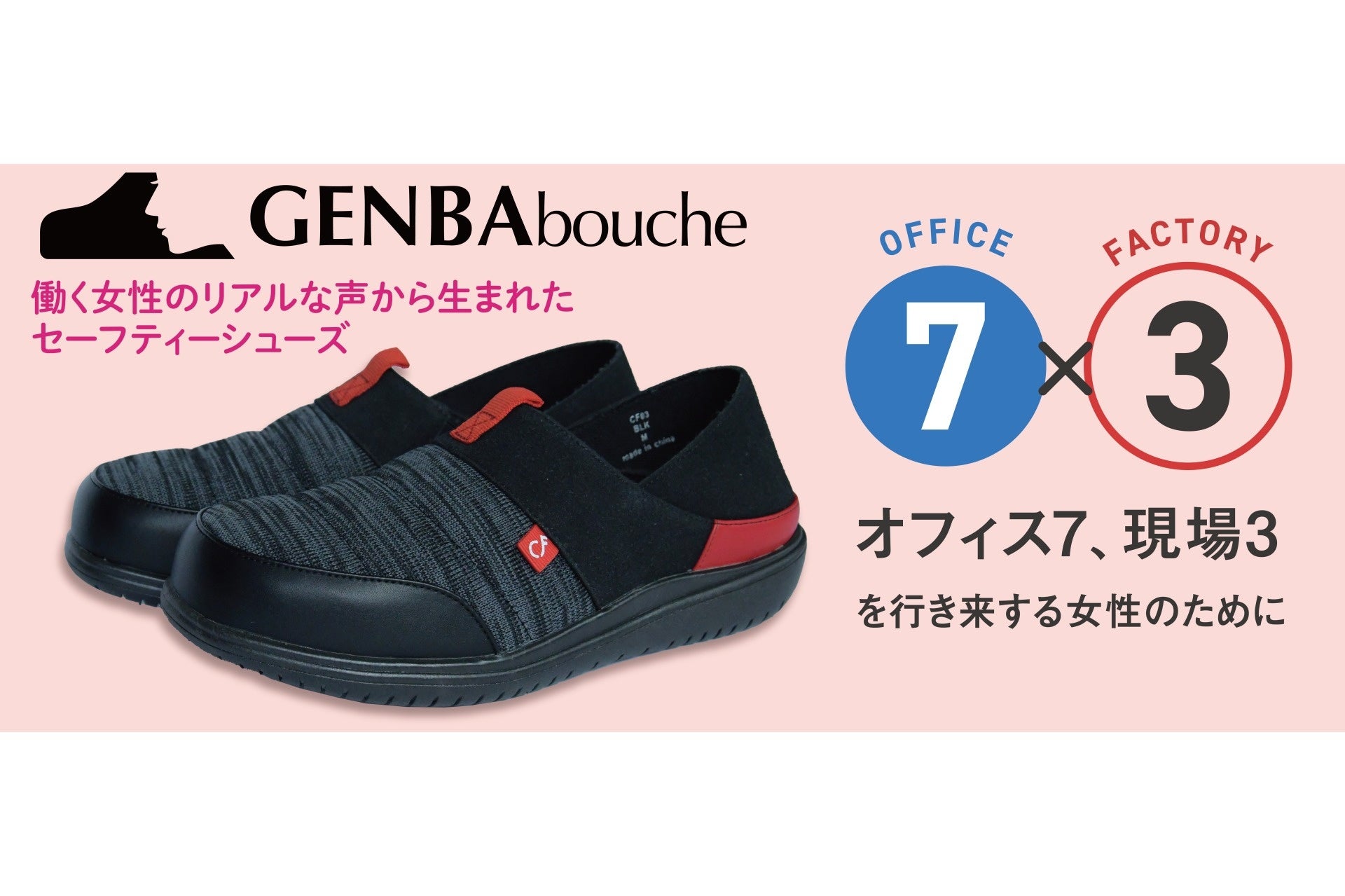 ゲンバブーシュは、オフィスで働く女性が室内履きに求める「疲れにくく通気性がいい」ことと「危険性がある現場から足を守る」相反するニーズを満たす履き替え不要のセーフティシューズです。