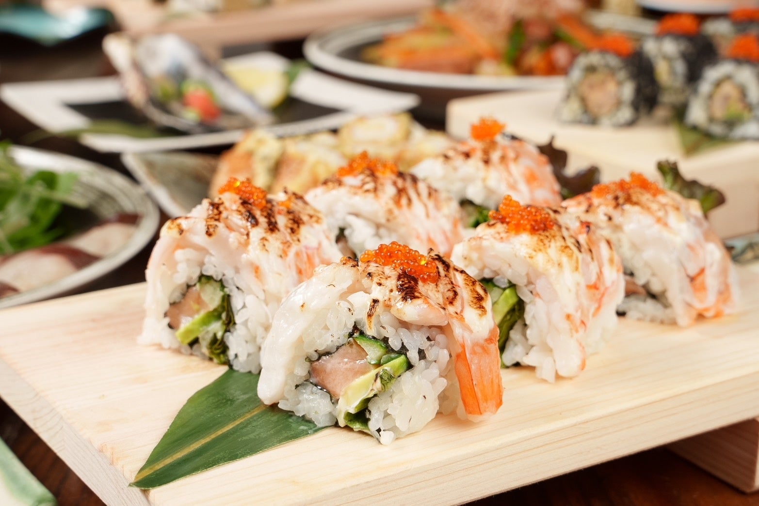 裏巻き寿司の定番カリフォルニアロールをはじめ、炙りエビアボカドロール、スパイシーツナロール、パパイヤとエビのロール寿司など、