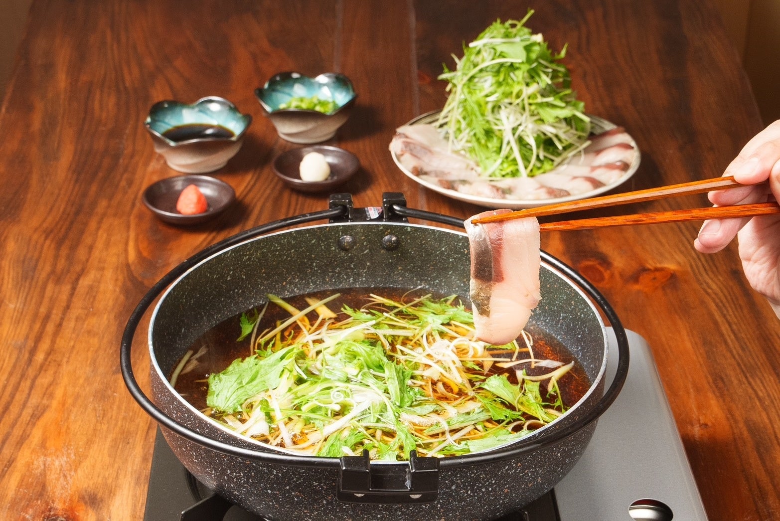 脂ののったブリを使ったしゃぶしゃぶ。まずは野菜をたっぷり入れて、その中にブリの切り身を。赤い部分の色が少し変わったら食べごろ。ブリで野菜を巻いてご堪能下さい。〆の雑炊も絶品です♩
