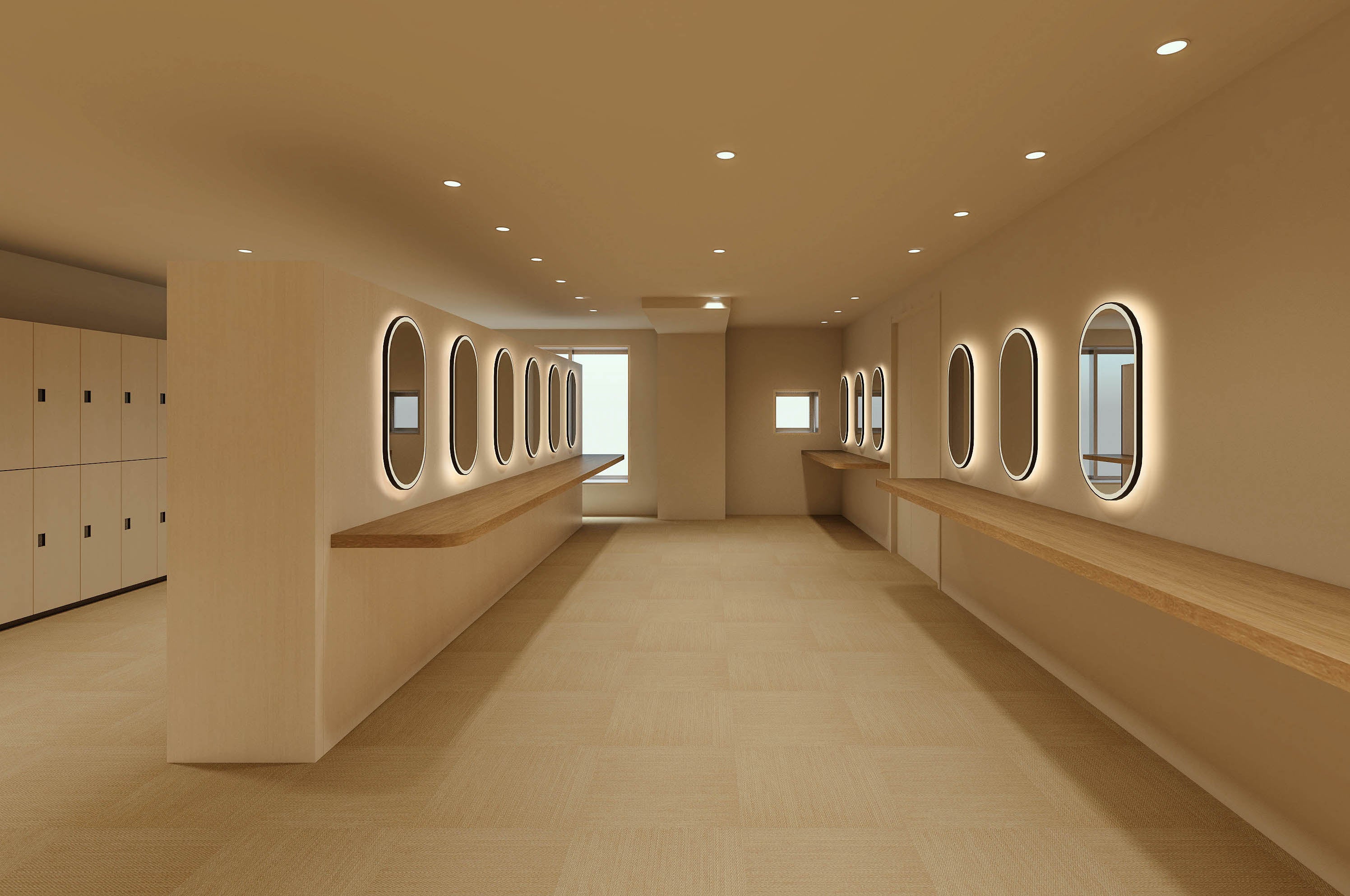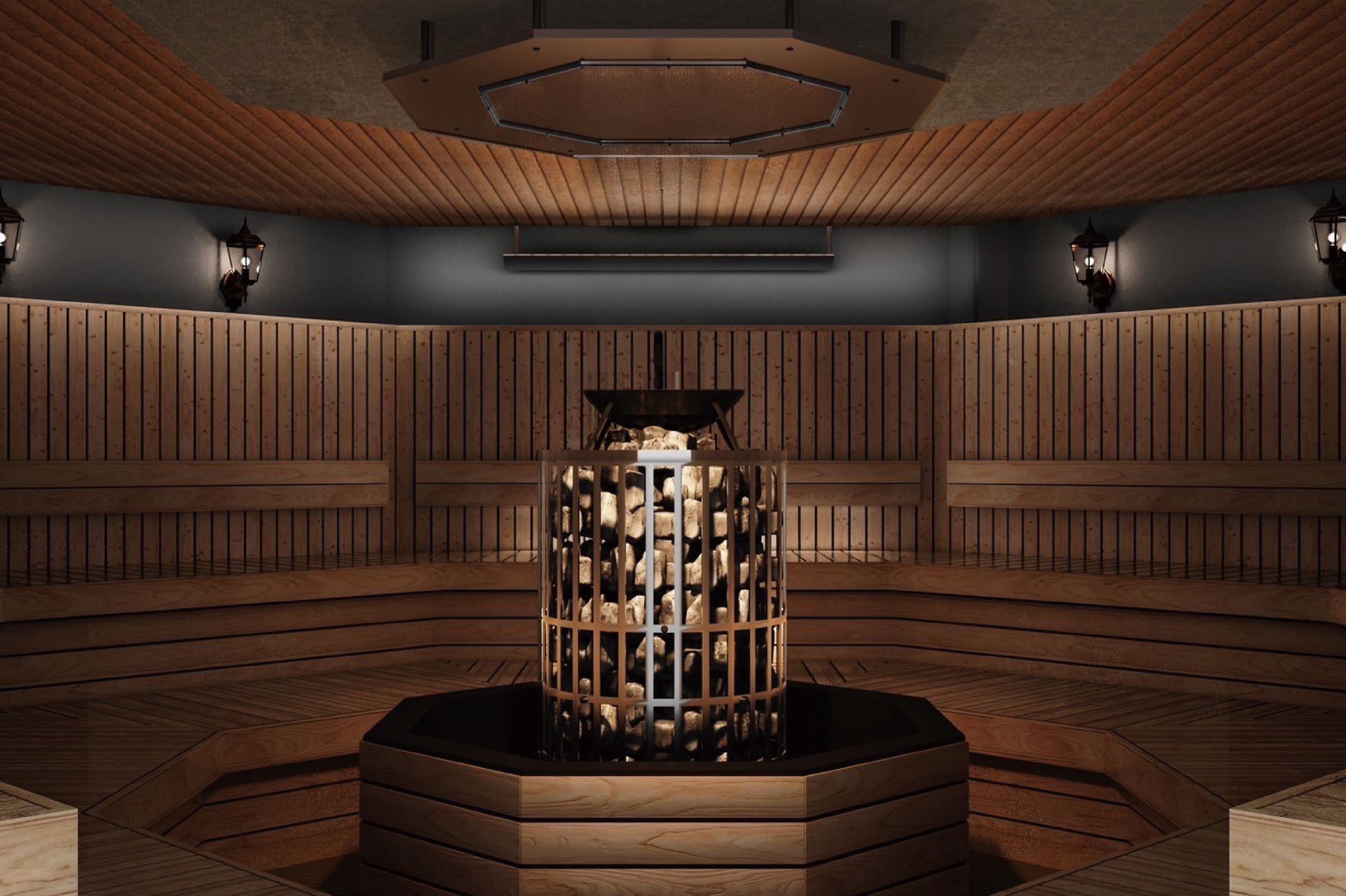 収容人数約30名の「八角形型のサウナ室」は新鮮な空気が滑らかに旋回する様に流れ、どの場所でも気持ち良い熱を楽しめます。また、定時の「オート薬草ロウリュ」により、快適な湿度維持がなされのとともに、薬草の芳醇な香りが広がり、深くリラックスできます。