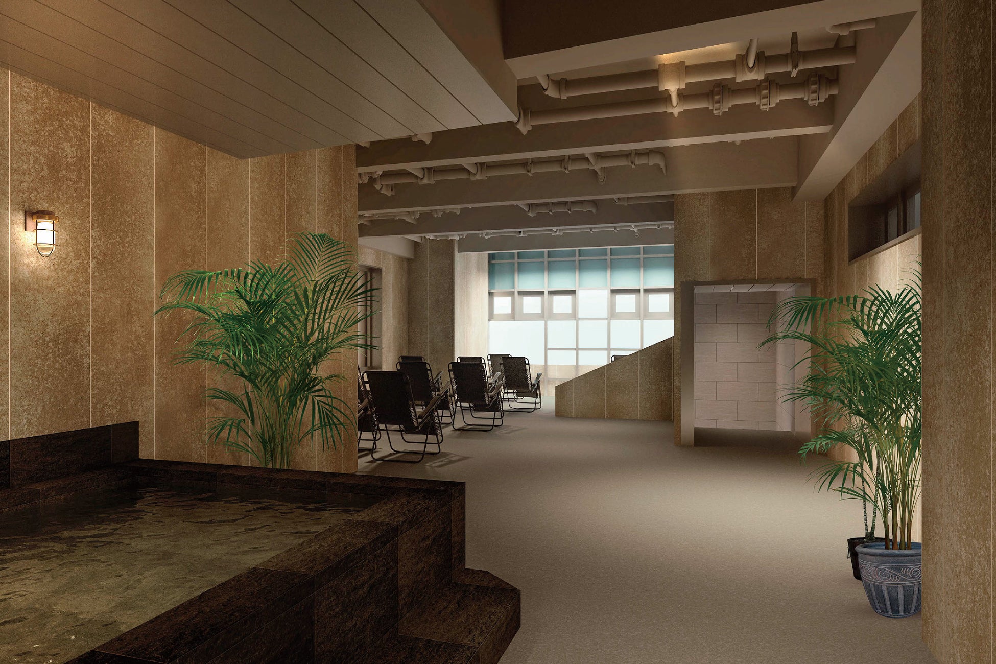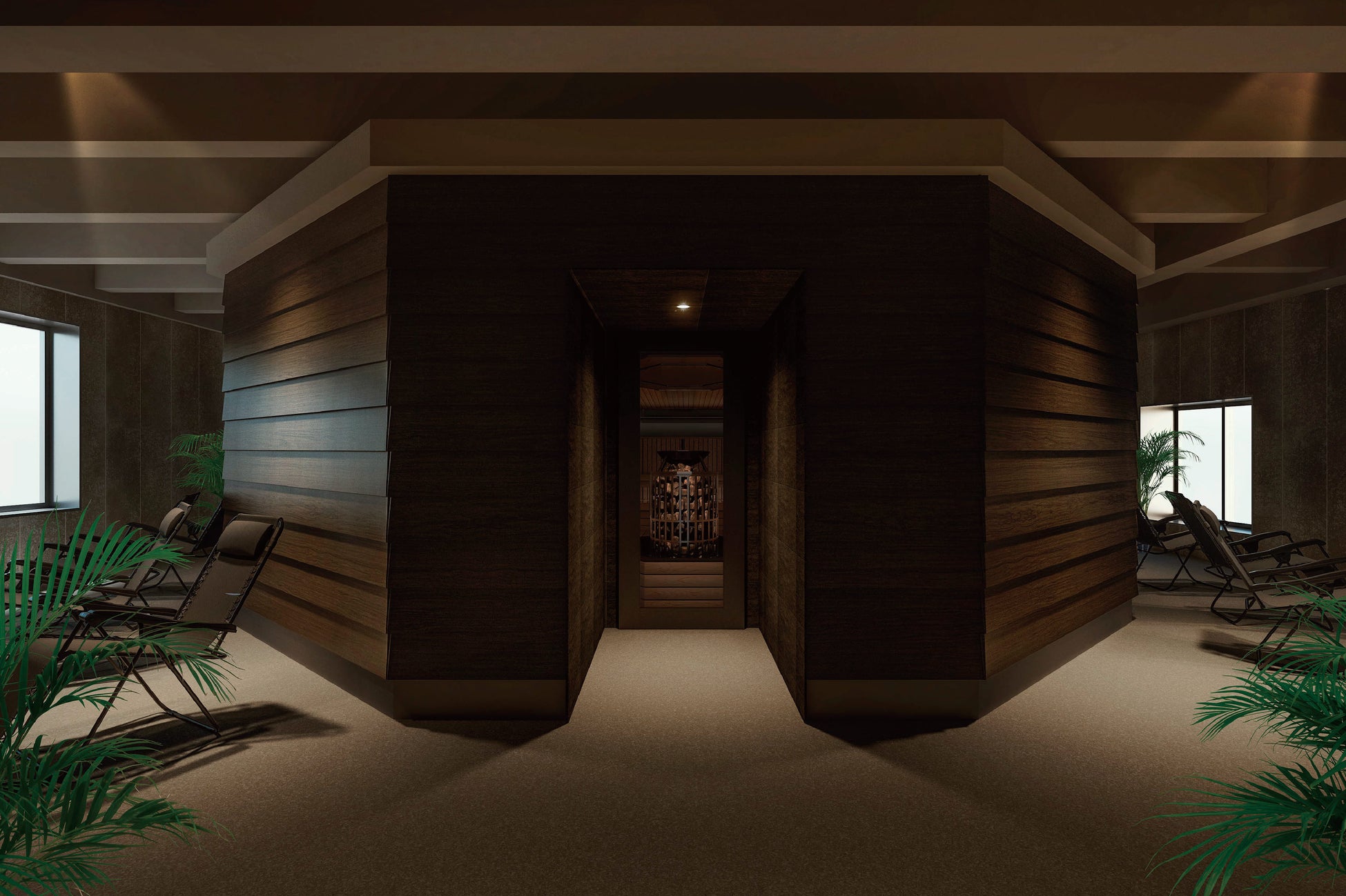 水風呂からの動線も良く、「約40脚ものリクライニングチェアを設置したととのいエリア」は、ふんだんに取り入れた外気と植栽により、森林の爽快感を演出。森林浴による「極上ととのい体験」をゆっくりとお楽しみください。