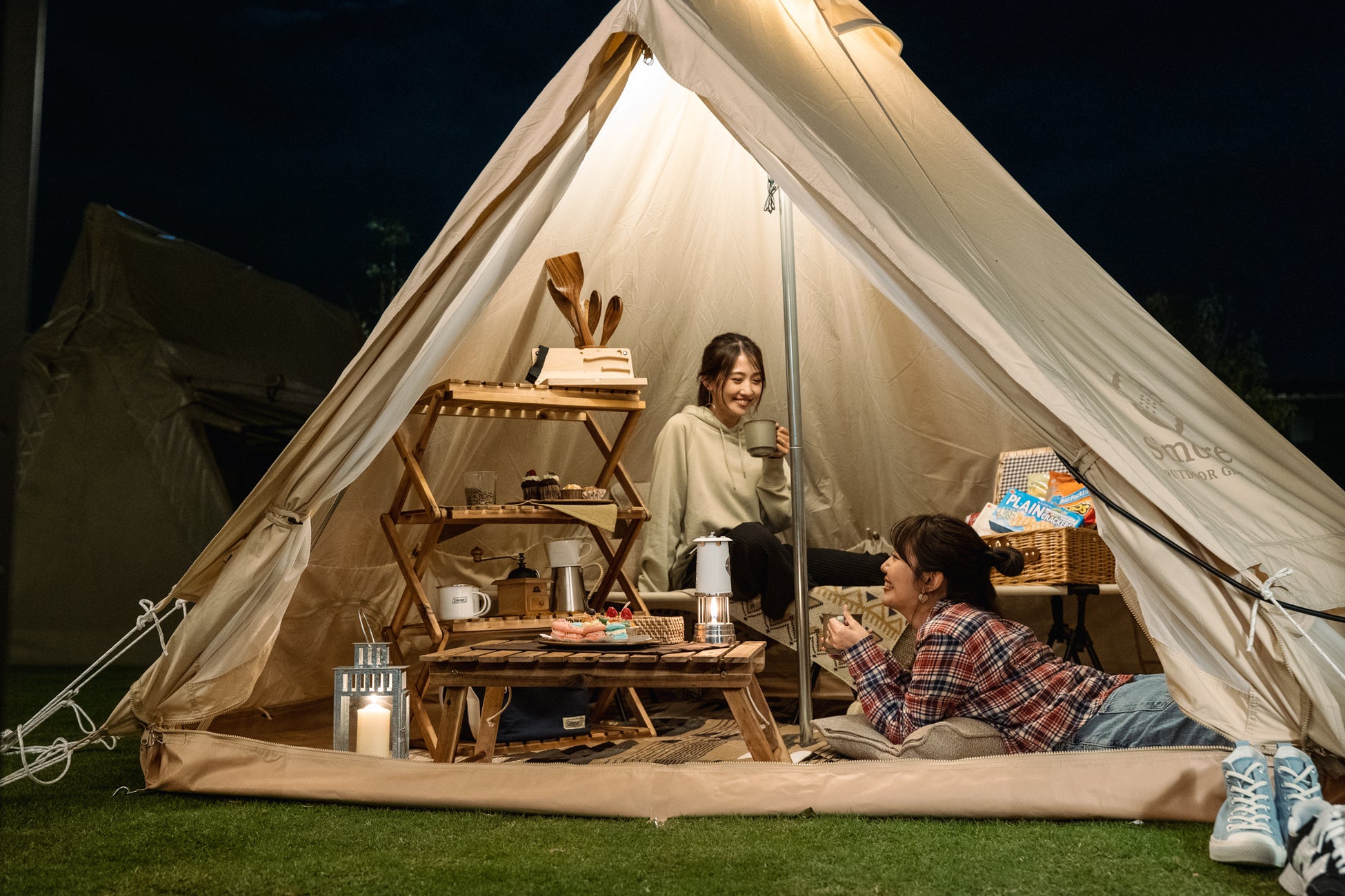 おしゃれにコーディネートされたテントでスイーツを食べながらおしゃべりしたり、薪割からファイヤースターター(スパークさせて火をつける道具)を使った焚火体験、お食事の後は揺らぐ炎を見ながらリラックスタイム。