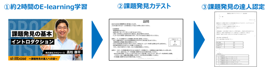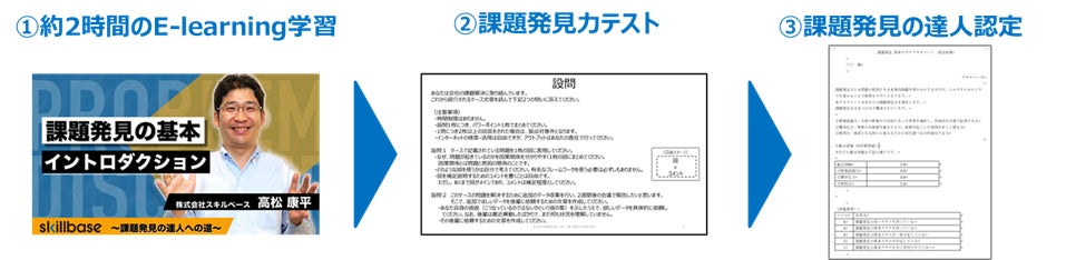“課題発見”や“問題解決”をテーマにした研修は各所で数多く実施されてきました。しかし、従来型研修では根本的な課題発見力の向上には繋がりづらく「実務に生かせる効果的な学びになりにくい」という声を多く耳にしました。今回、このような悩みを解決したいという思いから、課題発見ができる人材(課題発見の達人)になるためのサービス「課題発見の達人」のローンチに至りました。E-learning で課題発見のスキルを学びます。その後、課題発見力テストを受け、テスト結果で一定の基準を満たした方を「課題発見の達人」として認定します。基準に満たない方は、受講期間内であれば再提出が可能ですので、受講生全員が「課題発見の達人」を目指すことが出来ます。