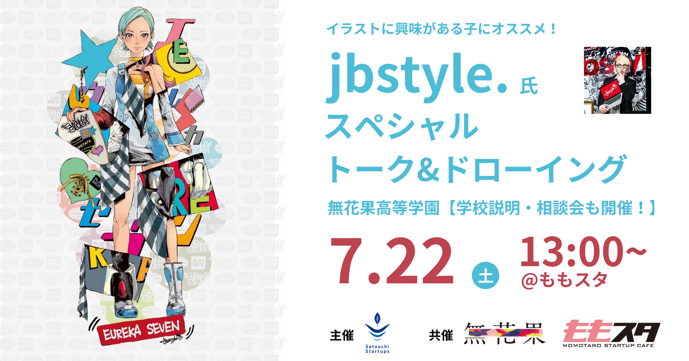 当コース開設に先立ち、2023年7月22日(土) 13時より、ももスタ(岡山県岡山市北区駅前町1丁目8-18 イコットニコット 2階)にてイラストレーターのjbstyle.氏をお招きしたイベントを開催いたします。