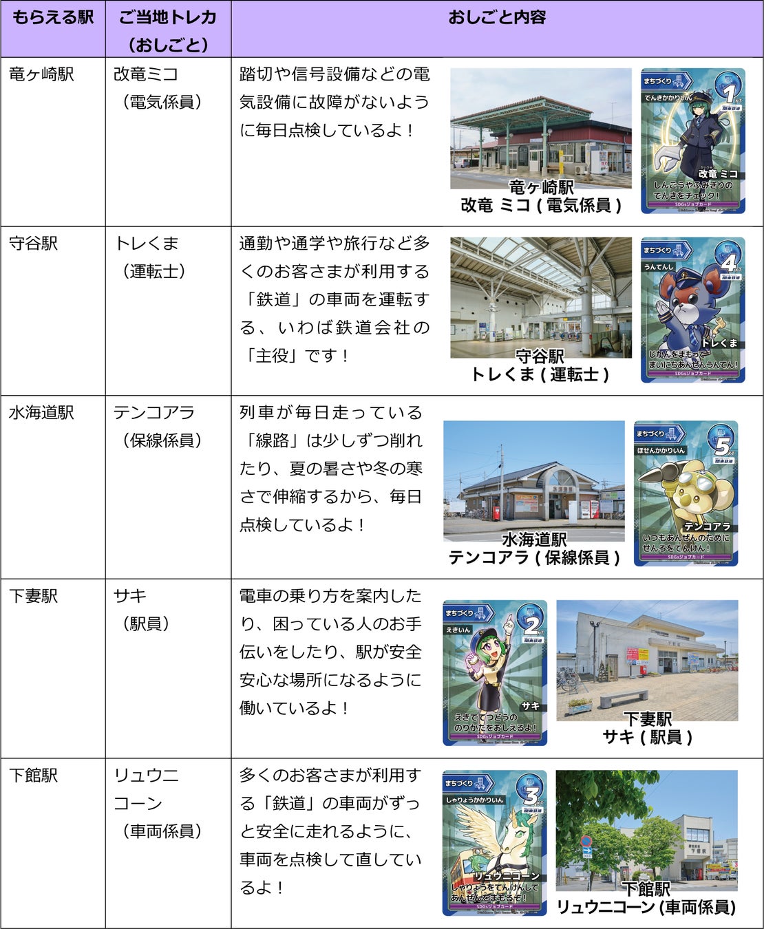 もらえる駅ともらえるご当地トレカは次のとおり。各駅でご当地キャラクターがキミの到着を待っているよ!鉄道のおしごとはこれだけじゃないから、他にも鉄道のおしごとをたくさん学びに来てね!