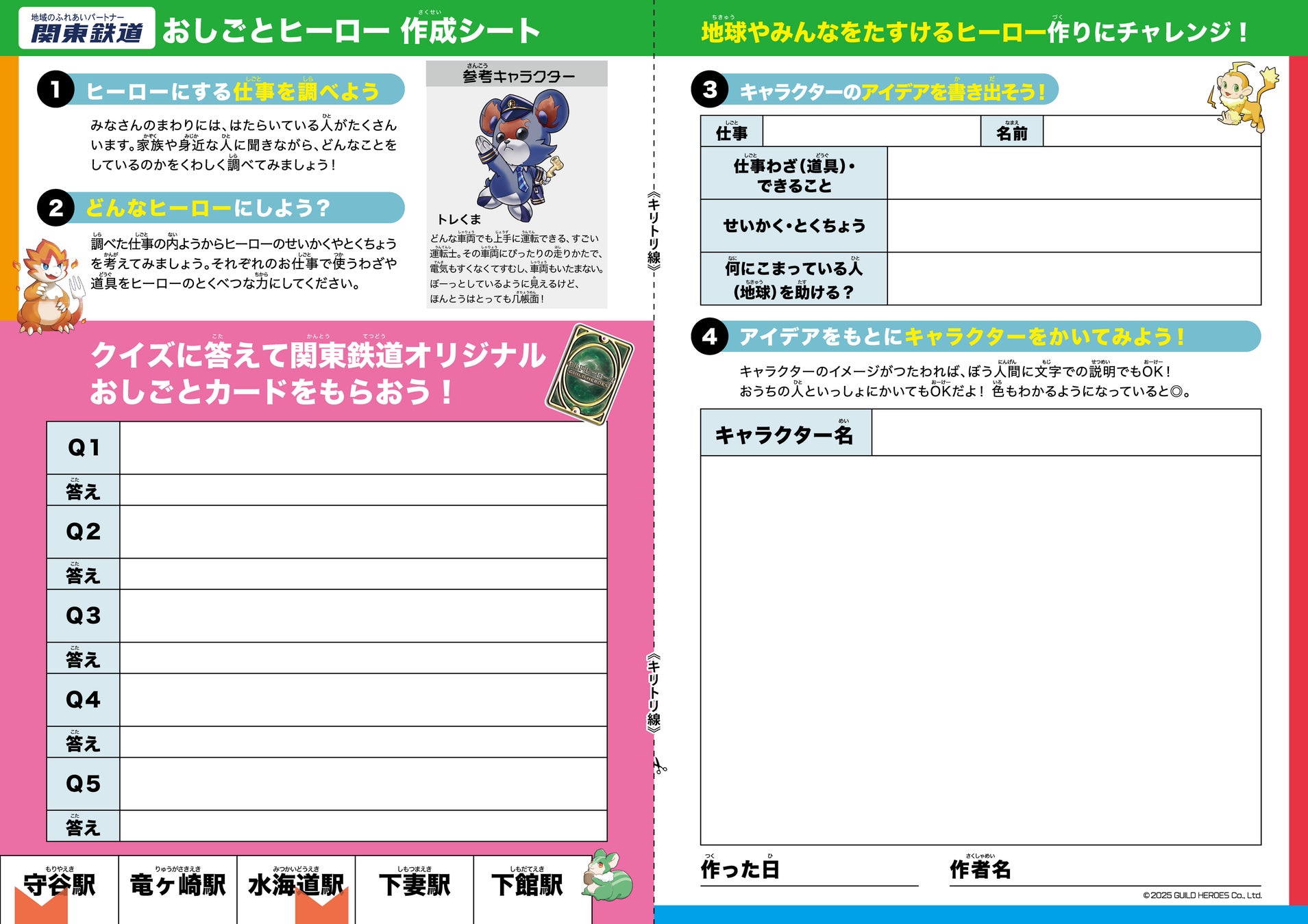 本イベントは、関東鉄道の駅を巡って鉄道の仕事に関するクイズに挑戦し、正解すると駅限定の“ご当地おしごとトレカ”がもらえる体験型ラリーです。対象駅では昭和に活躍した改札鋏(バサミ)が復活します。 全5種類のカードを集めた後は、自分だけの「鉄道のおしごとヒーロー」を描いて自由研究として提出できます。これは、2022年に創立100周年を迎えた関東鉄道と、職業教育に取り組むギルドヒーローズの連携による取り組みの一環であり、2024年の職業教育ワークショップの成功を踏まえ、より多くの世代へと学びの場を広げる狙いです。学び、創造、地域社会とのつながり、家族の交流、思い出、子どもの成長と、夏休みの自由研究に最適なイベントとなっています。