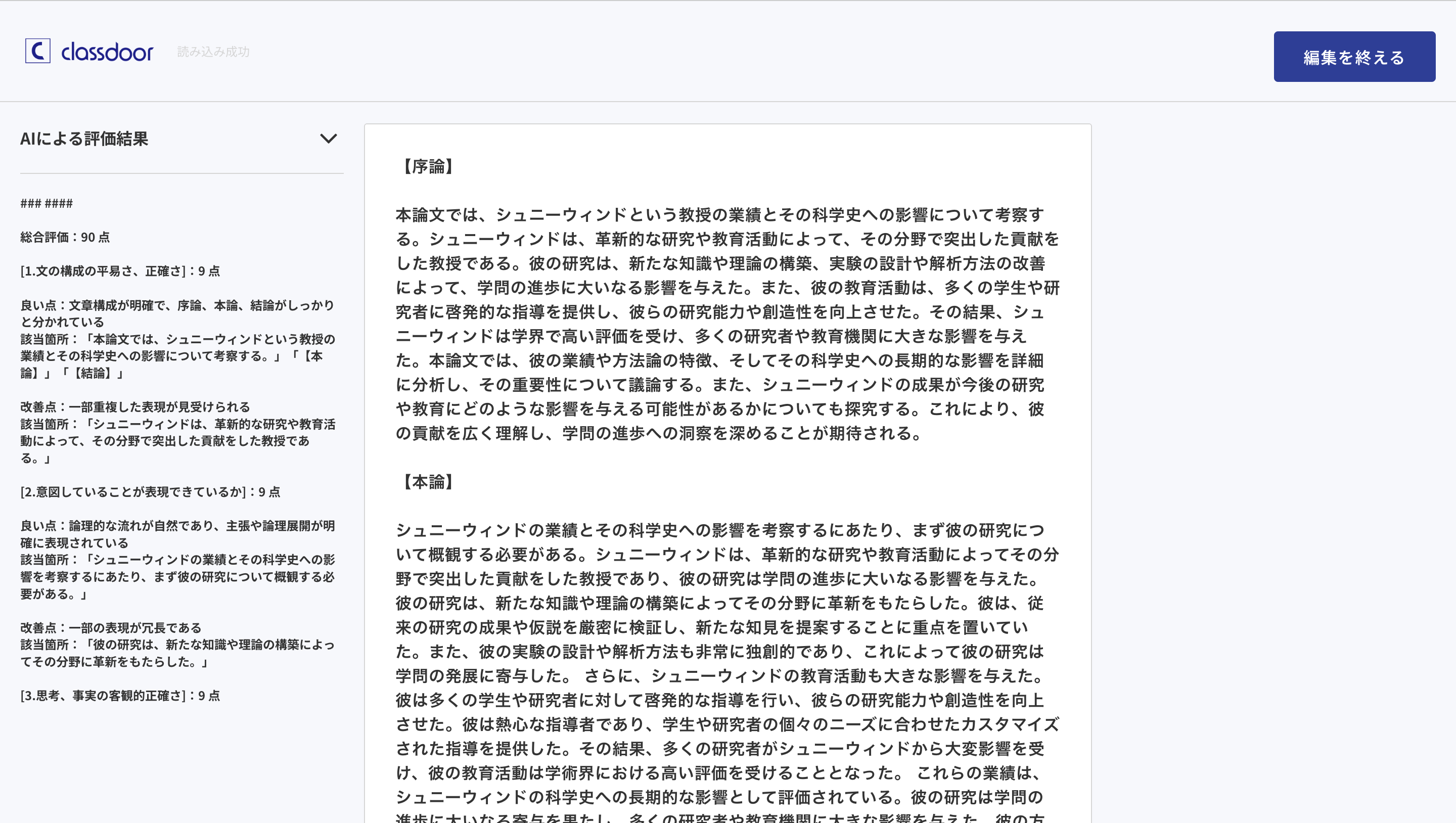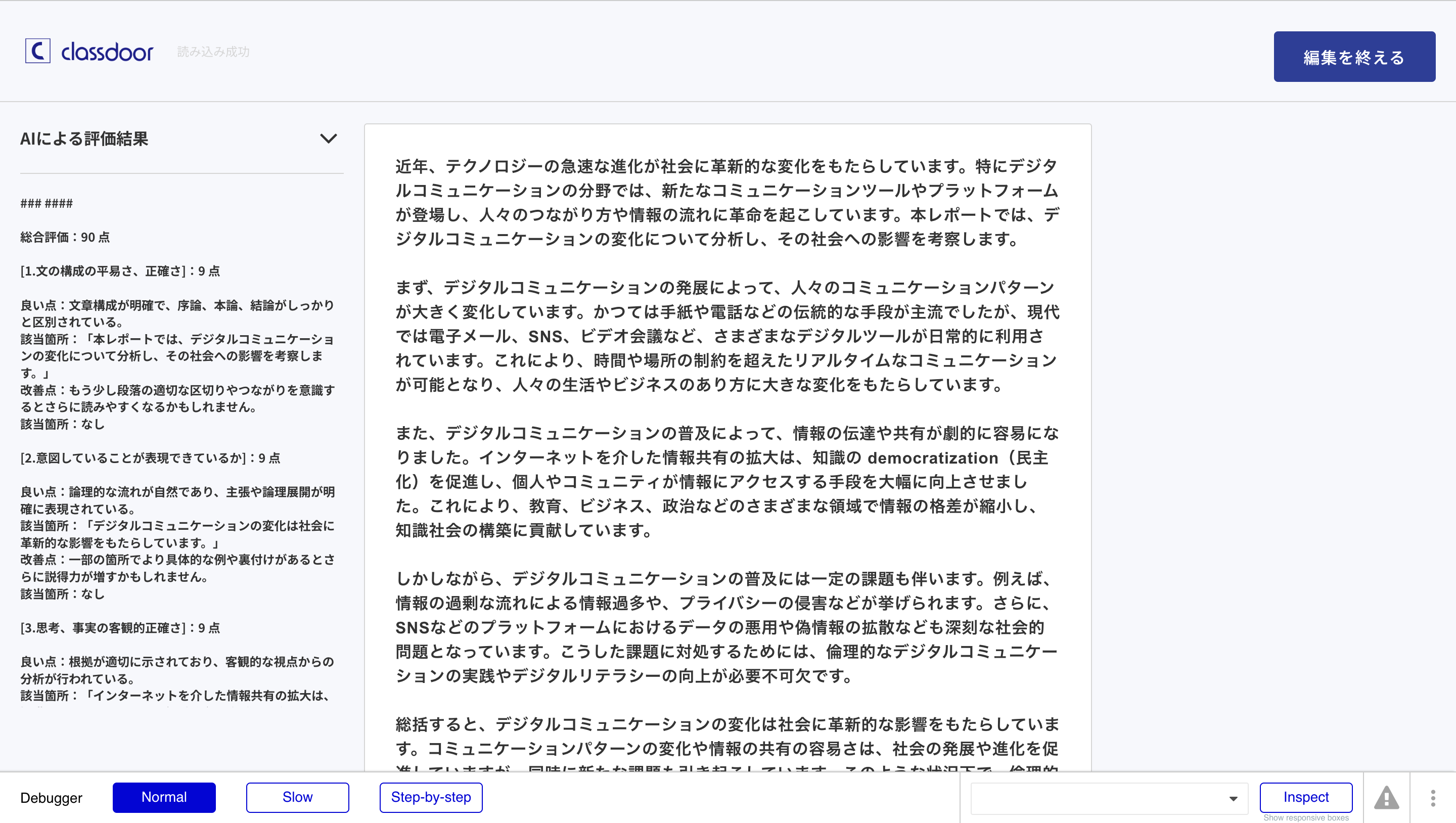 マイページからで直接AIレポート評価したレポートが、classdoorのレポート作成ページで編集可能になりました。α版に比べ透明性を向上させたレポート編集ページで、ストレスなくレポートを編集できます。