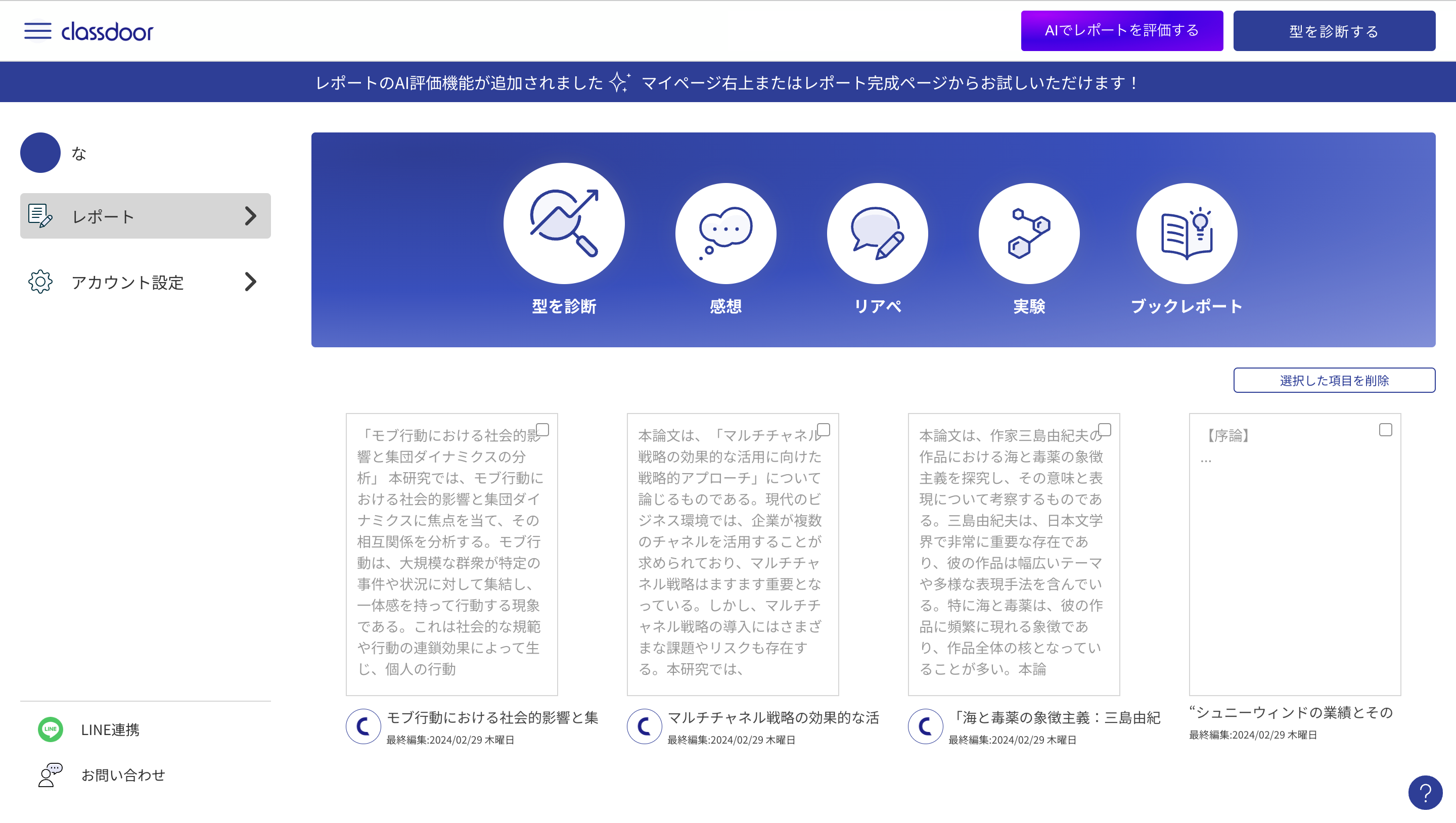 classdoorで作成したレポートと、AIレポート評価機能で作成したレポートがマイページ内で分からなくなってしまうという問題を解消しました。classdoorで作成したレポートについては独自のロゴが付くようになり、一目で判別できるようになりました。