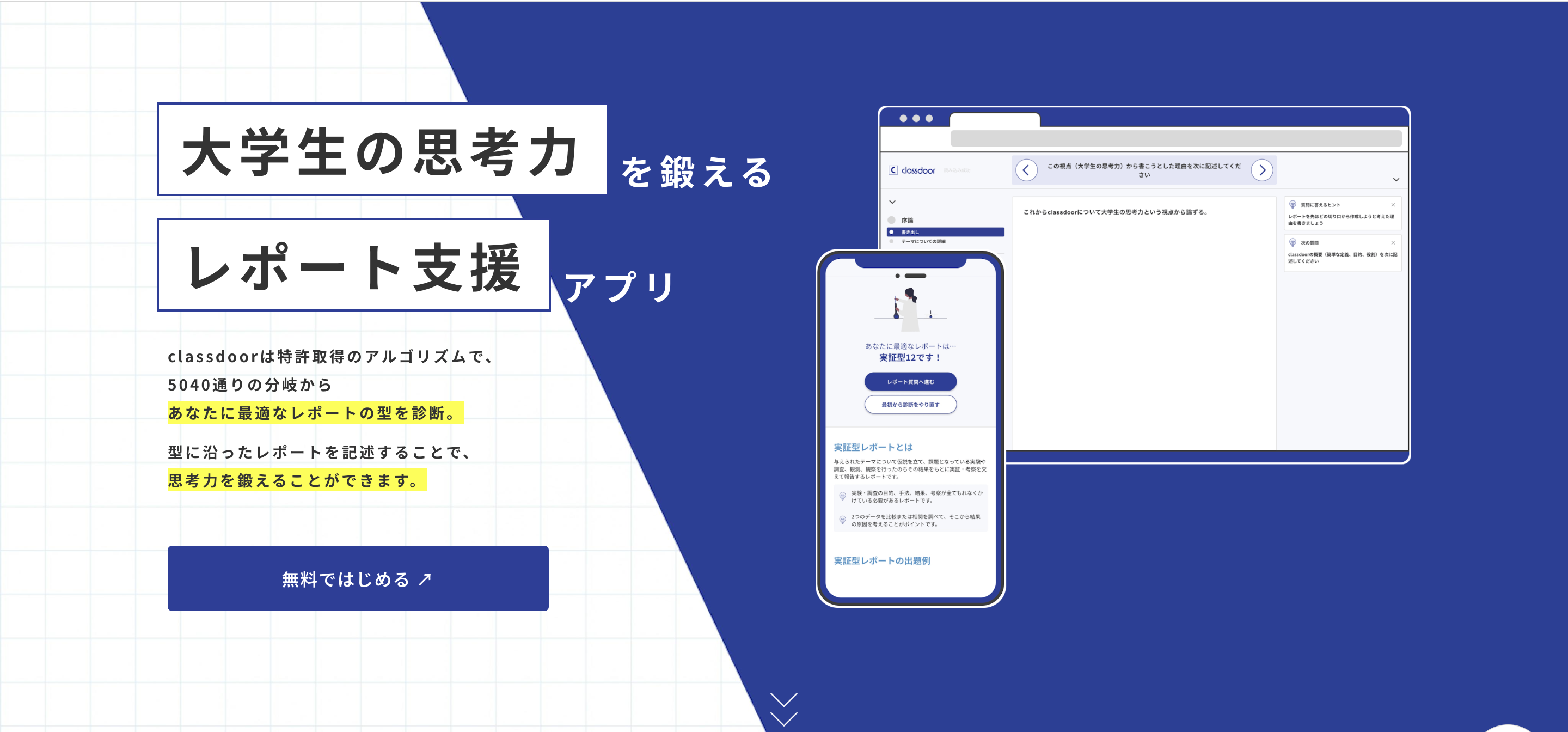 「classdoor」は、独自の特許取得済みロジックを活用し、5040通りのレポート型の中から最適な構成を提案します。簡単な設問に答えて文章を記述することで、どなたでも品質が高く適切な文章構成のレポートを作成できます。レポートの型を使った執筆補助と、AIレポート評価機能のフィードバックにより、文章構成力を大きく成長させます。